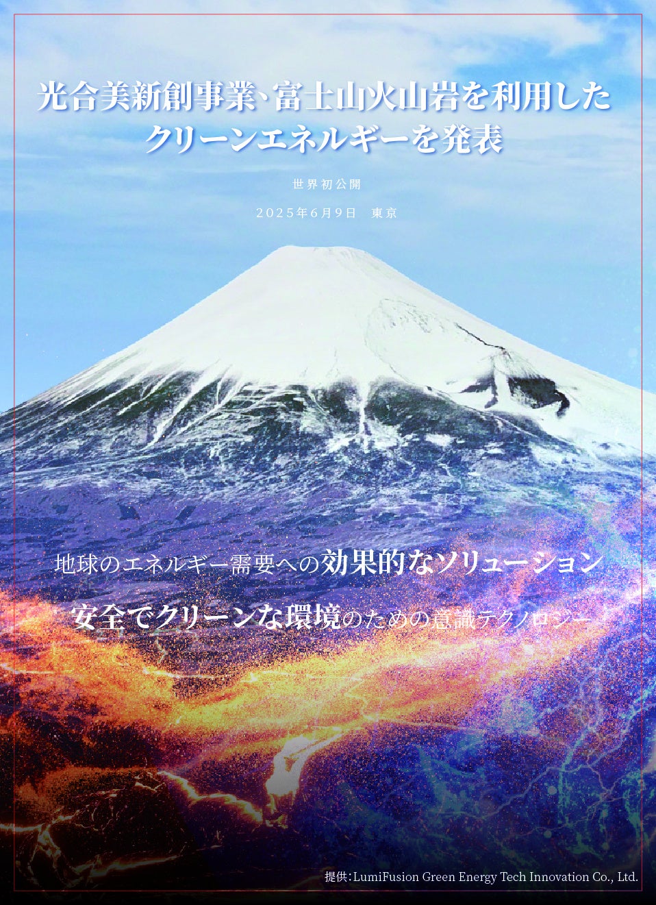 2025年6月9日、光合美新創事業株式会社(コウゴウビシンソウジギョウ)は、東京にて「富士山の火山岩を利用したクリーンエネルギー」の発表会を世界で初めて開催します。富士山の火山岩を基に、安定して電力を生み出す新しいクリーンエネルギーが公開されます。この画期的な技術は意識テクノロジーと融合しており、世界的なエネルギー危機と気候変動への革新的な解決策となることが期待されています。