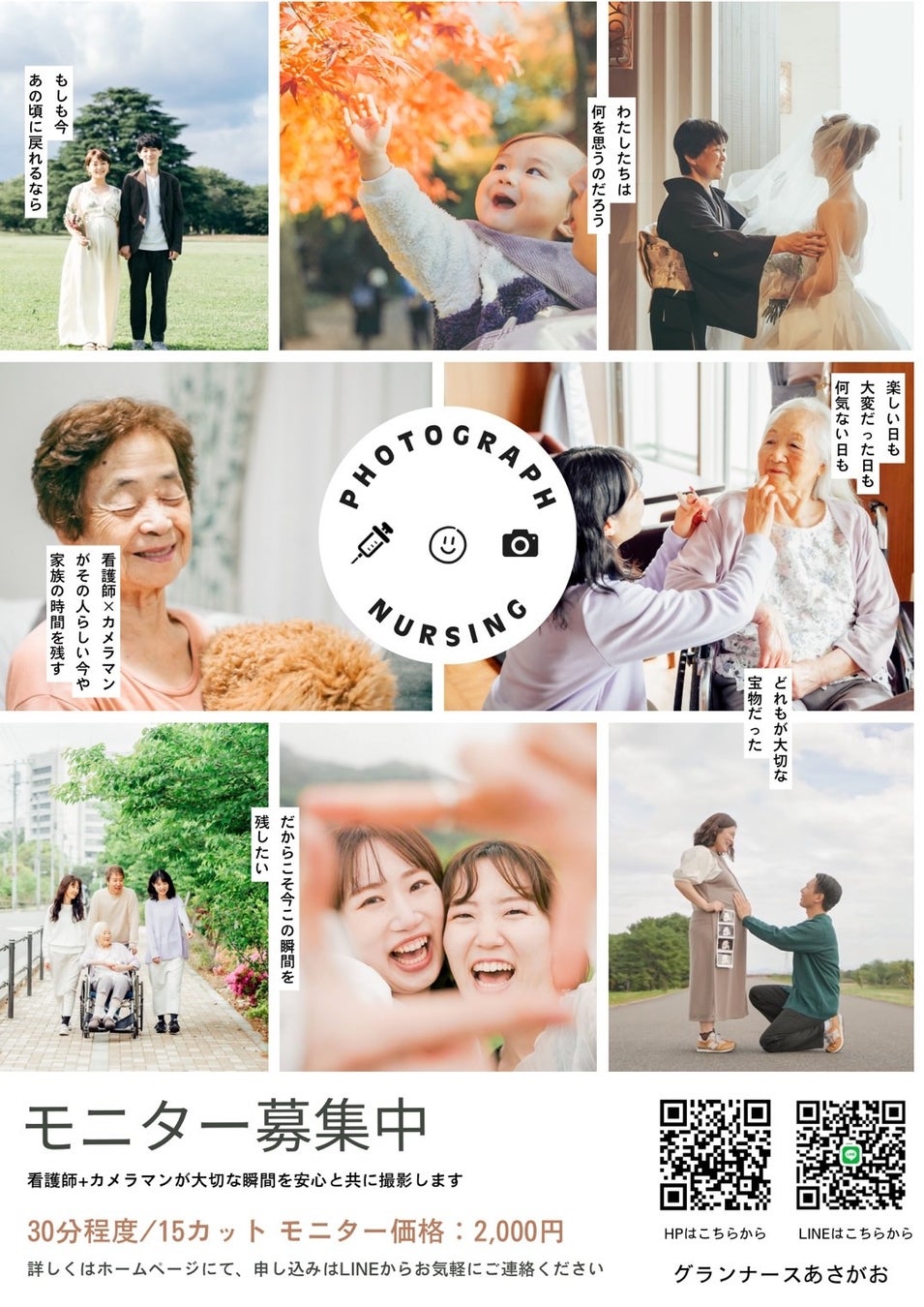 夜間特化の24時間訪問看護や、グリーフケア(喪失の悲しみに寄り添う看護)を提供している「グランナースあさがお / Jgran株式会社(所在地 東京都千代田区 代表取締役 木村淳子)」は、看護師とカメラマンがご家族や大切な人との“今”を記録する新サービス「PHOTOGRAPH NURSING(フォトグラフ・ナーシング)」を開始。2025年8月31日まで、先着15名様限定で、通常30,000円のサービスをモニター価格2,000円(税込)でご体験いただけます。