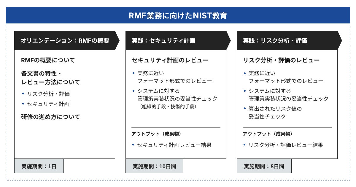 RMF対応業務において、初動対応で必要となる「セキュリティ計画」および「リスク分析・評価」の対応プロセスを演習形式で学びます。実践的な演習を繰り返して実施するため、実務に役立つ知識の習得が可能です。