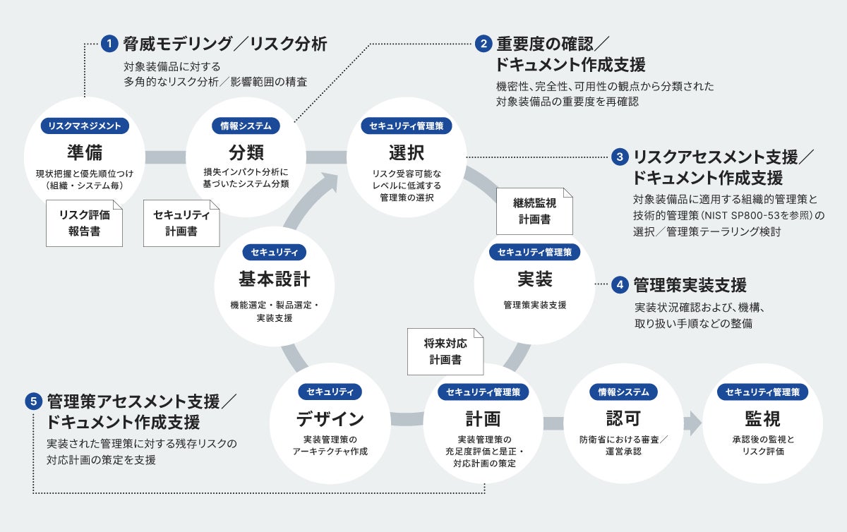 米国国防総省(DoD)や防衛省で導入されているRMFに関する各種コンサルティングサービスを提供し、DoDI 8510、NIST SP800に準拠した体制構築を全面的に支援します。RMFコンサルティング経験が豊富な、国内有数の専門チームがRMF対応の早期実現と継続的実施をサポートします。