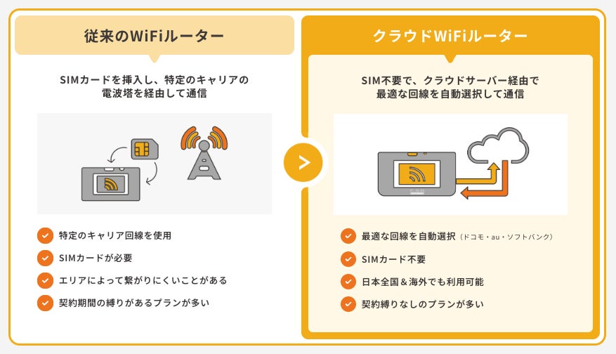 クラウドWiFiルーターはSIM不要で、クラウドサーバー経由で最適な回線を自動選択して通信します。