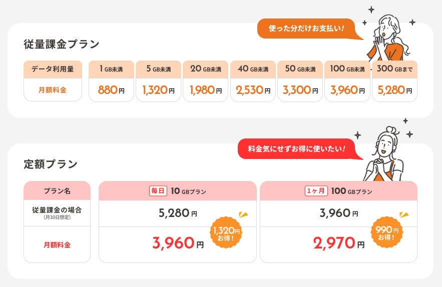 使った分だけ or お得に大容量、好みに合わせて選べるプラン。格安携帯と組み合わせればスマートに節約!