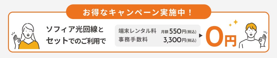 ソフィア提供インターネット回線「ソフィア光」とセットでのご利用で端末レンタル料月額550円(税込)と事務手数料3,300円(税込)が0円になるお得なキャンペーンを実施中です。