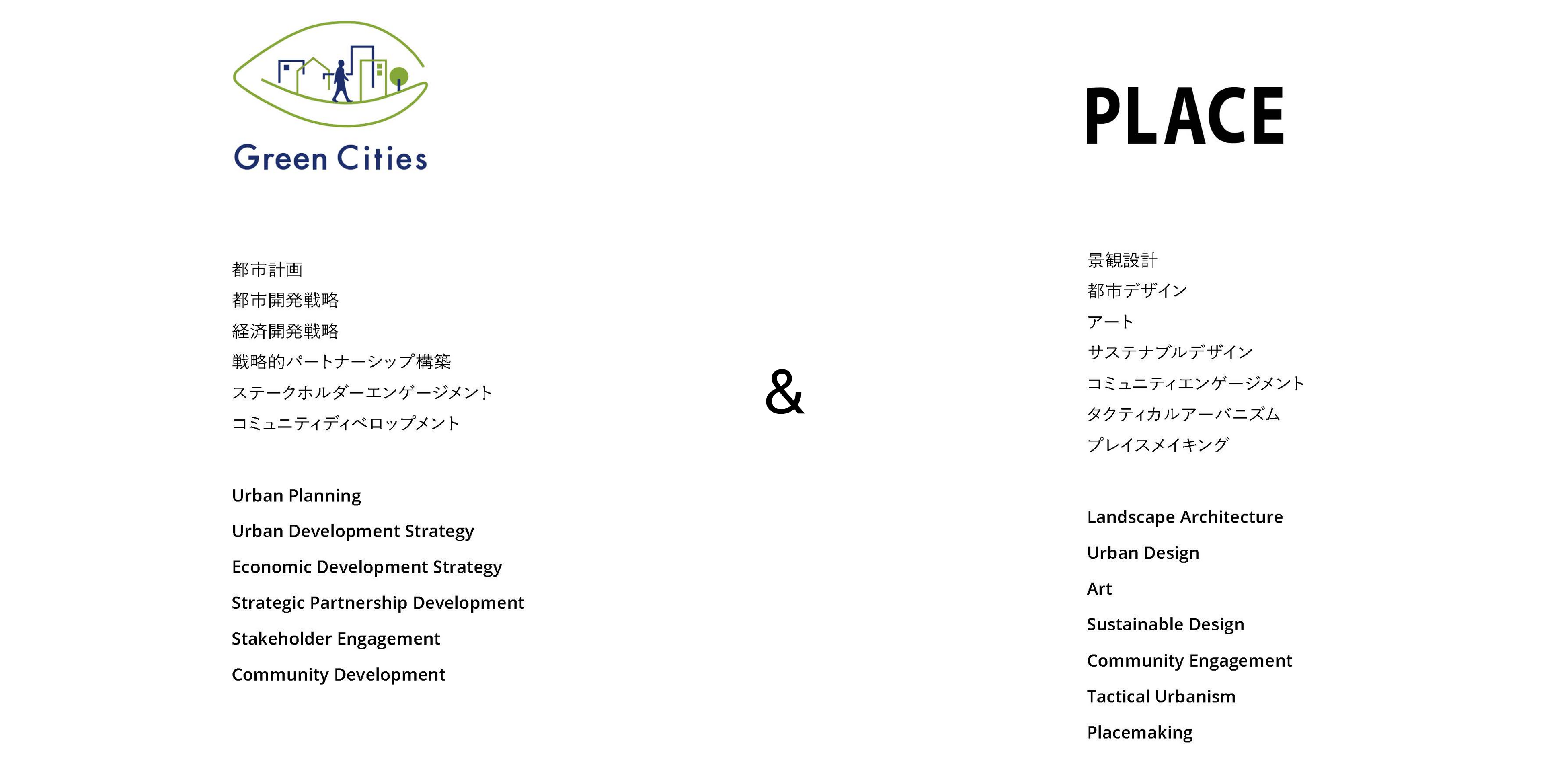 Green Cities と PLACE は、これまでもポートランドおよび日本でのまちづくりプロジェクトで協働し、イノベーションを起こしてきました。全米で一番住みたい街 ポートランドで培われた知見と、国際的にも評価されている景観設計デザイン、日米での都市開発・事業開発に関する専門知識を組み合わせ、日本特有の地域性やニーズに沿ったコンサルティング力を強みに、環境や地域の資源を守りながら、地域経済の活性化・安定化を促すための開発、誰もが暮らしやすく持続可能なヒューマンスケールのまちづくりを提案します。