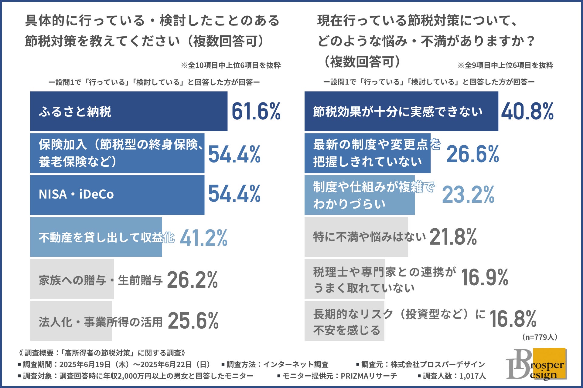 株式会社プロスパーデザイン(所在地:東京都中央区、代表取締役:竹下 孝司)は、年収2,000万円以上の男女を対象に、「高所得者の節税対策」に関する調査を行いました。