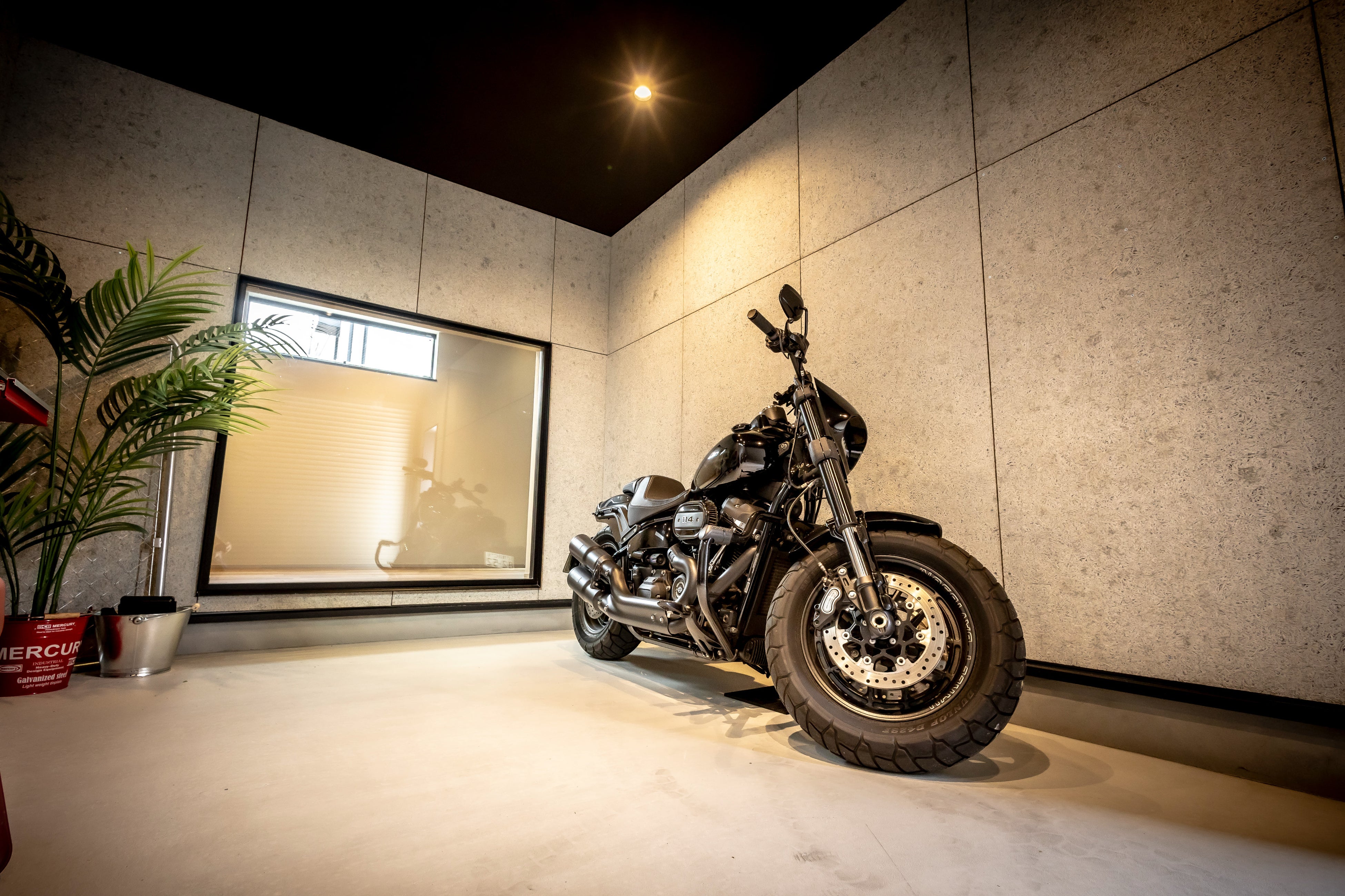 部屋からライトアップされた愛車が見える間取りや、使い勝手にこだわったガレージ、スイッチなどの細かな部材、それぞれがバイク乗りの琴線にふれる住宅に仕上がっています。