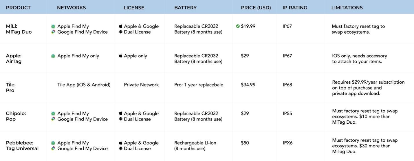 MiLi MiTag Duoが最適なトラッカーである理由:MiTag DuoとTile、Chipolo、Pebblebee、Apple AirTagの比較