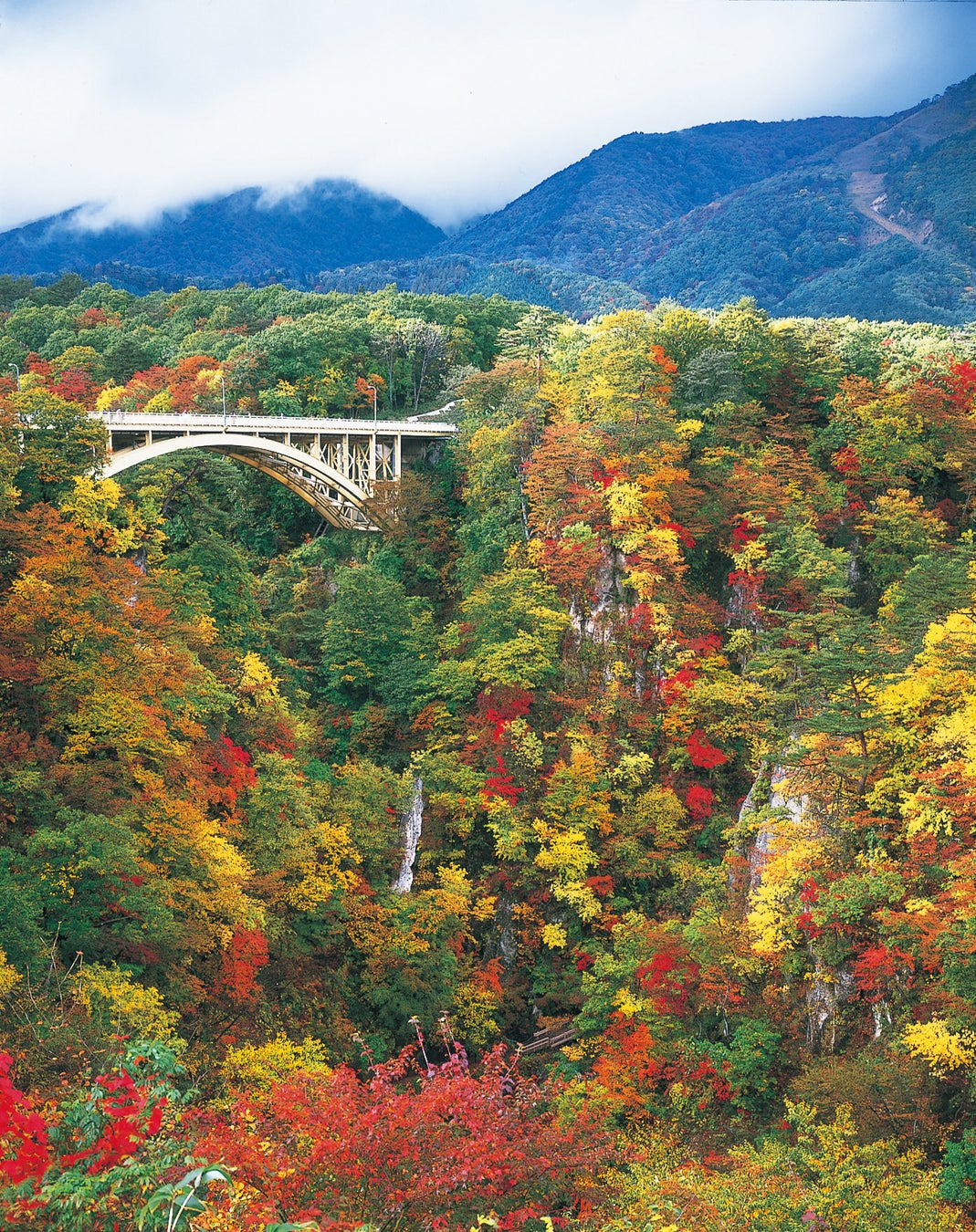 深さ約100メートルの断崖が約2.5キロメートルにわたって続く壮大な渓谷。複数のビュースポットがあり、「鳴子峡レストハウス」からは大深沢橋と紅葉のコラボレーションが楽しめ、展望デッキも設置されています。「大深沢橋」からは、紅葉に染まる峡谷とJR陸羽東線の列車が走る姿を一望。また、「鳴子峡遊歩道」や「大深沢遊歩道」を散策すれば、渓流のせせらぎと紅葉の美しさを間近に感じることができます。