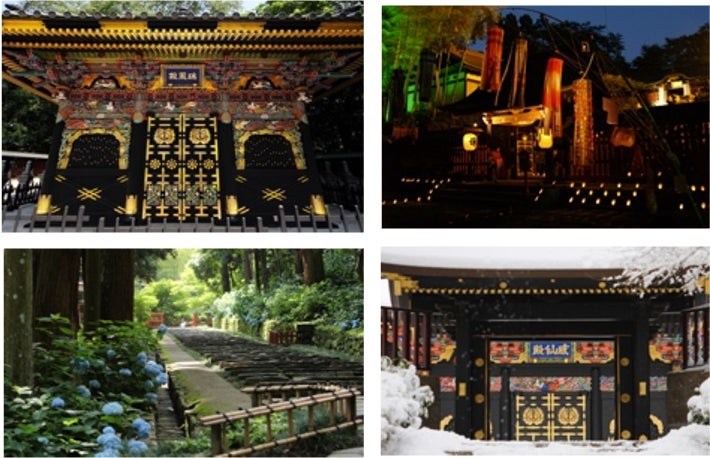 仙台藩初代藩主・伊達政宗公の霊廟。極彩色の彫刻や金箔など桃山様式の華麗な装飾が施されています。杉の木に囲まれた参道もフォトスポットとして人気。桜や紅葉はもちろん、仙台七夕まつり期間、境内が竹灯篭でライトアップされたり、冬には白銀の世界に金色に輝く唐門など四季折々でさまざまな表情を楽しむことができます。