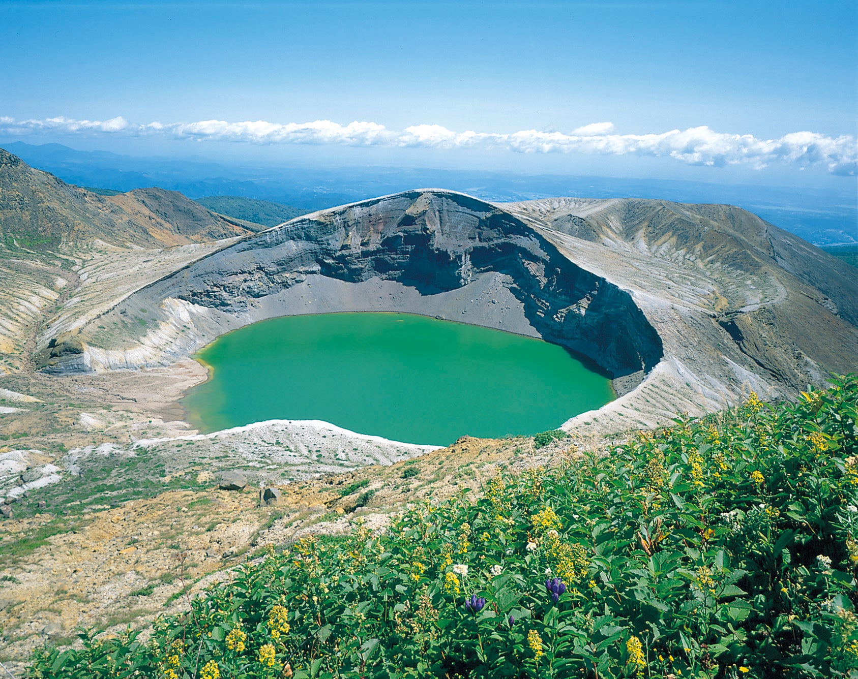 標高約1,600メートルの火口湖で、エメラルドグリーンの神秘的な水面が特徴。山頂付近の展望台からは360度のパノラマビューが楽しめるほか、周辺には遊歩道も整備されており、散策しながら四季折々の自然と御釜の景色を堪能することができます。特に秋には紅葉が美しく色づき、湖の神秘的な色合いとのコントラストが絶景が楽しめます。