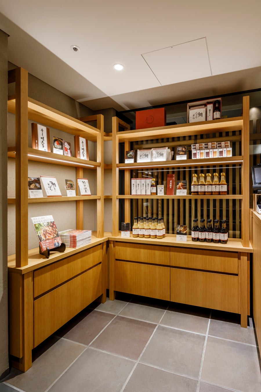 テーブル席に加えて、1名様から利用しやすいカウンター席を新たに設置。旧店舗を彷彿とさせる、懐かしい雰囲気を再現しました。カウンター席には旧店舗に使用していた竹を再利用しています。また、旧店舗のボックス席をイメージしたテーブル席には、テーブルを仕切る障子に旧店舗の包装紙を利用しました。お土産コーナーでは、新規事業となるご家庭向け商品「家庭割烹」シリーズを販売いたします。