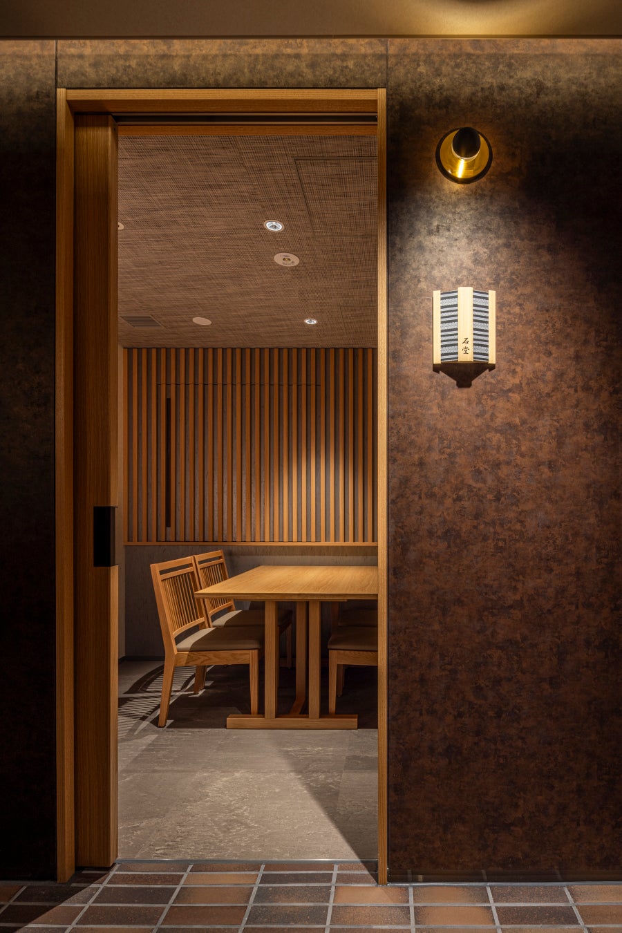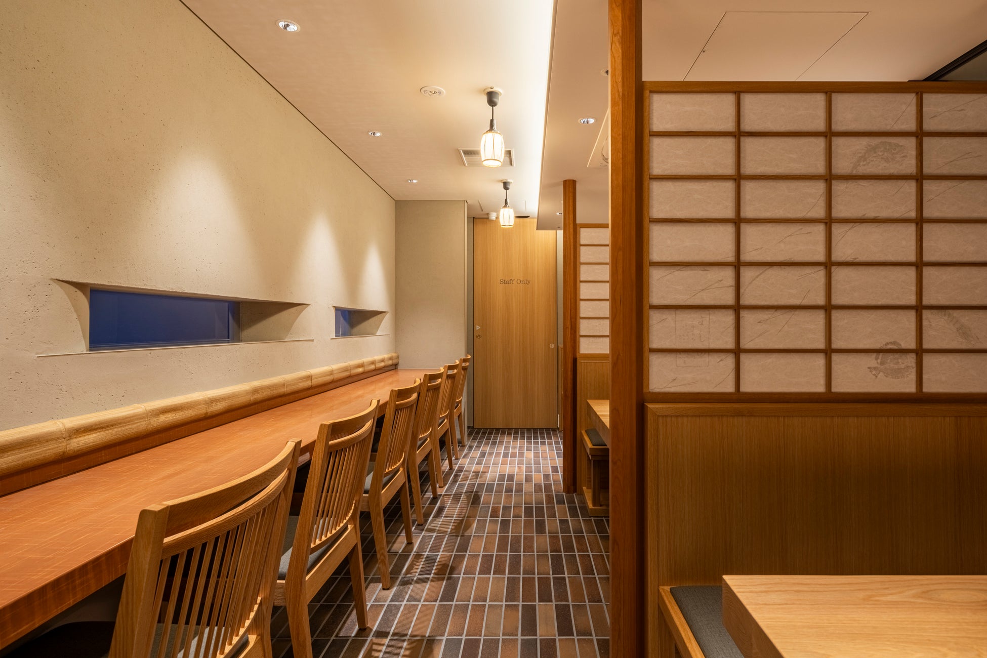 「繋がる」をコンセプトに、馴染みある店の雰囲気を新たに表現。旧本店、移転新設した博多店屋町店で使用しているコーポレートカラーのベンガラ色が基調の外観は、日中と夜間で異なる表情が魅力です。店内には、旧店舗で使用していた建築資材や装飾を各所に採用しています。
