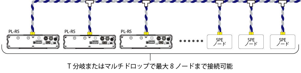 シングルペアイーサネット(SPE)とは、1ペア(2芯)で通信できるイーサネット技術です。主に産業機器やIoT機器の省配線・省スペース化を目的に使われます。最大1Gbpsの通信速度、長距離通信が可能、非常にコンパクトといった特長があり、センサ接続や制御機器の通信、車載ネットワーク等に適しています。PL-R5のSPEはT1S(10BASE-T1S)規格に対応しており、マルチドロップ接続もサポートし最大8台のノード接続が可能です。