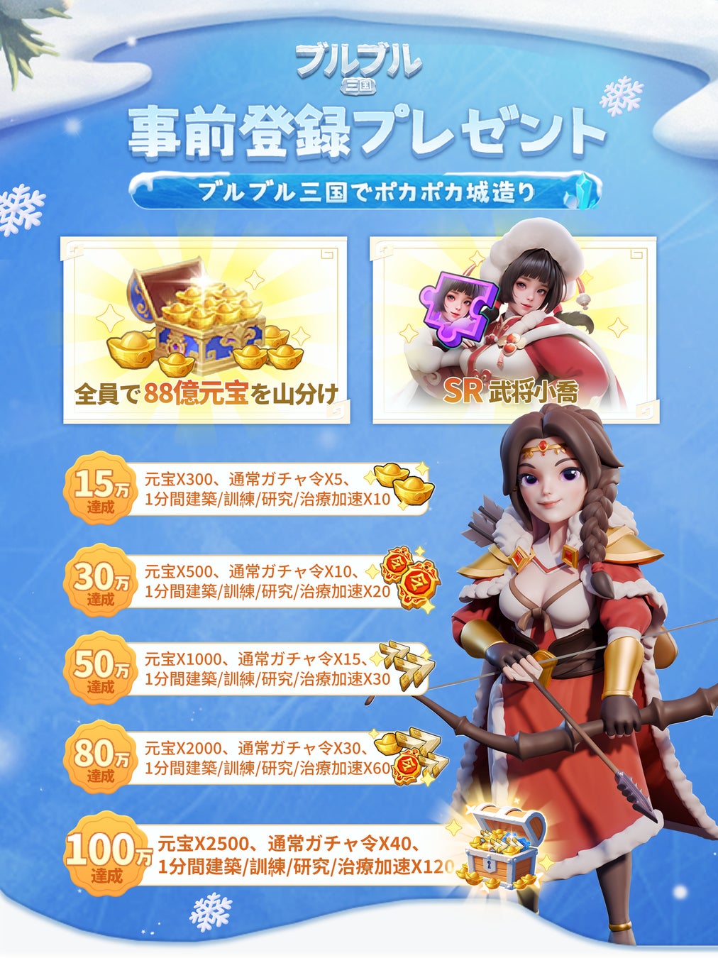 事前登録開始を記念して、本日より事前登録キャンペーンを開催!事前登録に参加した方には、SR武将「小喬」、元宝ランダム宝箱(総額88億元宝を山分け!)、限定フレーム、さらに日本限定の7日間主城スキンをプレゼント!その他の豪華特典も、登録者数に応じてどんどん追加されていきます!