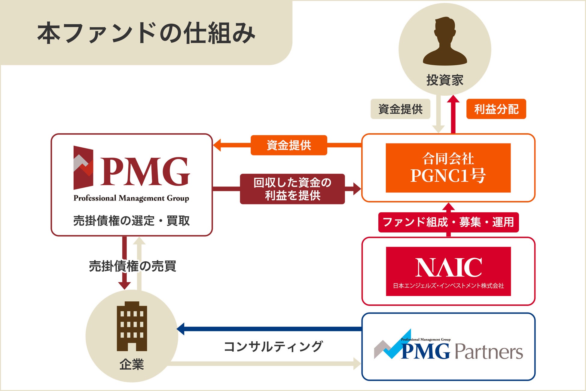 株式会社PMGホールディングス(東京都新宿区、代表取締役:佐藤 貢、以下グループを総称して「PMGグループ」という。)傘下のファクタリング事業運営会社ピーエムジー株式会社(東京都新宿区、代表取締役:佐藤 貢)は、2025年10月、日本エンジェルズ・インベストメント株式会社(東京都千代田区、代表取締役:若井 真、以下「NAIC」という。)と中小企業から買い取った売掛債権を投資対象としたファンド(以下「ファクタリングファンド」という。)「PGNC1号匿名組合ファンド」を設立したことをお知らせします。