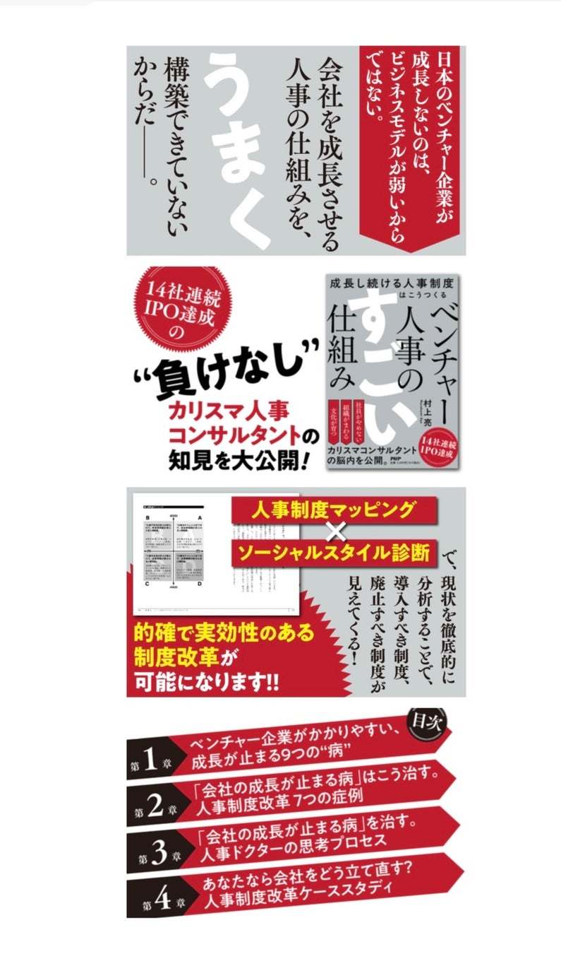 本書は、スタートアップから上場企業まで14社連続IPO支援を含む、300社以上の人事制度改革に携わった経験を体系化したものです。人事制度に潜む「9つの症候群」を切り口に、成長企業が陥りやすい落とし穴とその解決策を示し、人的資本経営を実装するための「すごい仕組み」を余すところなく解説しています。
