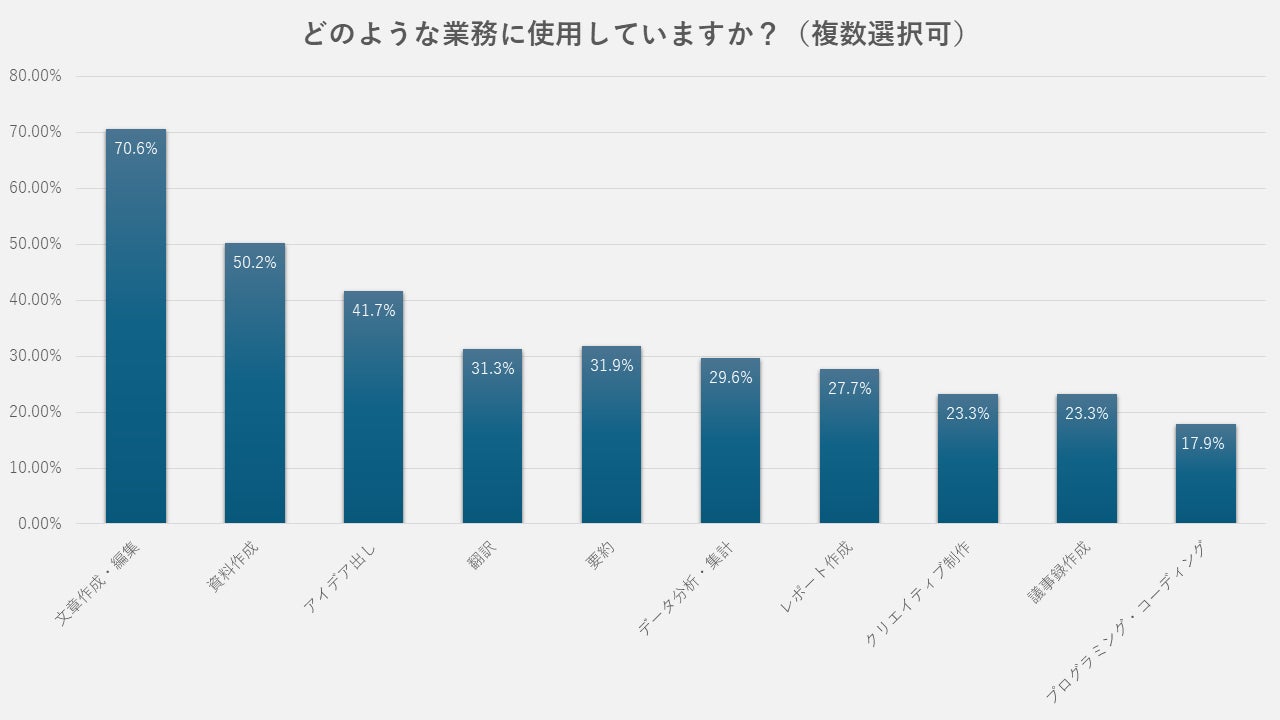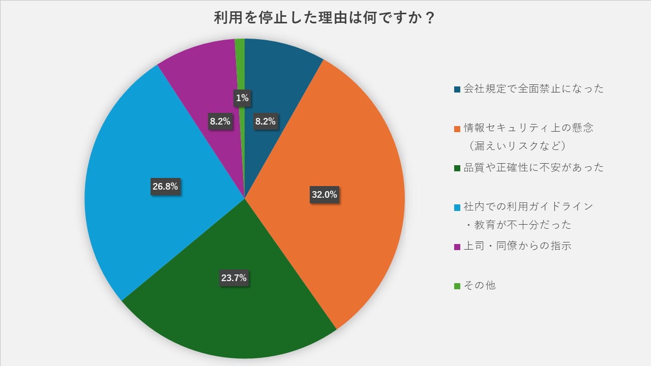 次いで、「社内の利用ガイドライン・教育が不十分だった」(26.8%)、「品質や正確性への不安」(23.7%)が続きます。