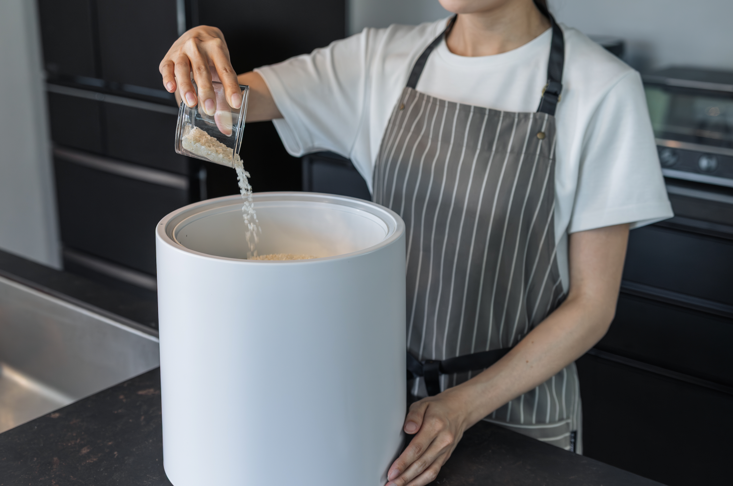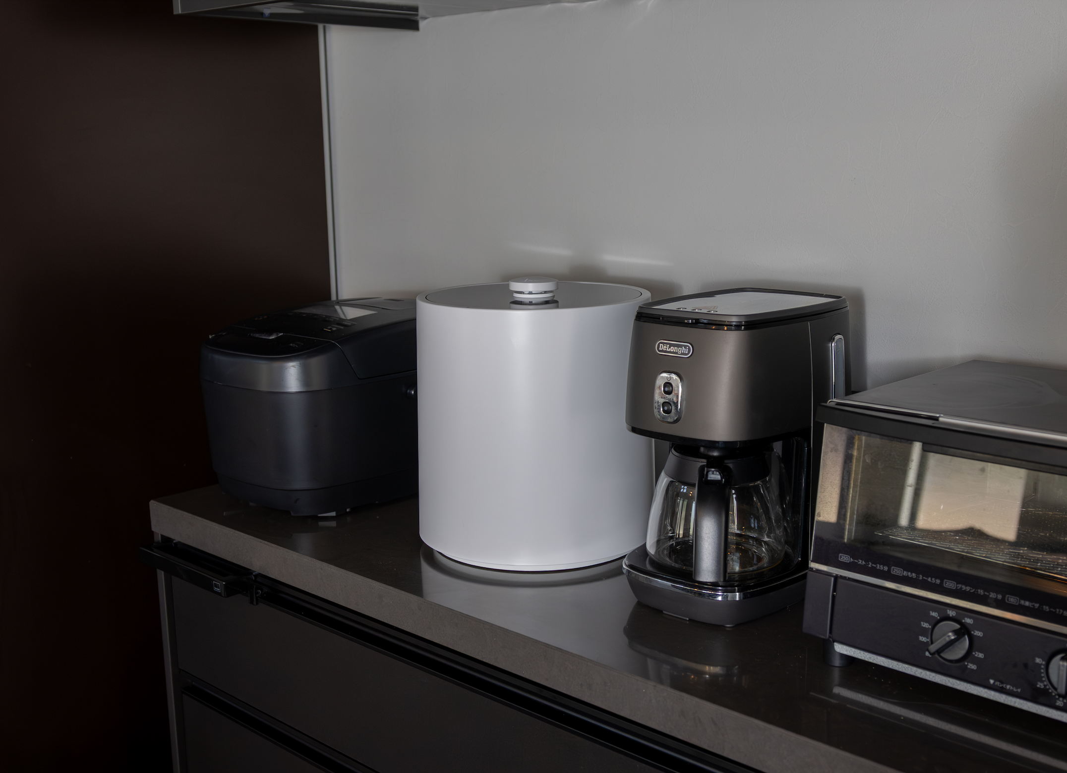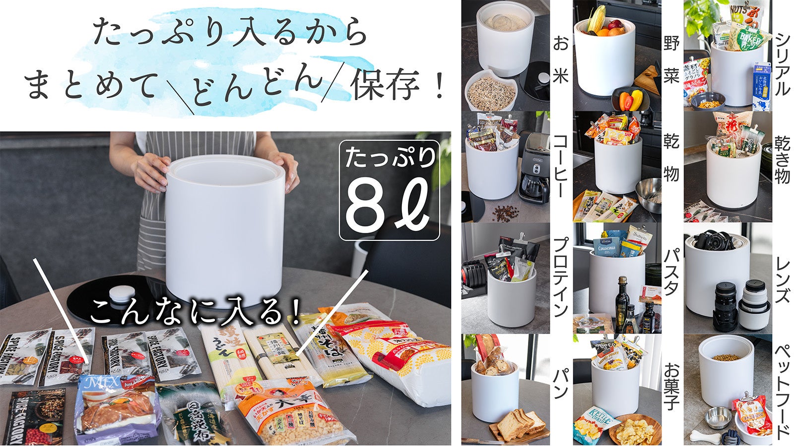 5kgの米や、袋ごと入る乾物・パスタ・コーヒー豆などをすっきり収納。キッチン収納棚やパントリーにも収まりやすいシンプルな円筒デザインで、インテリアに馴染みやすく、暮らしの美観も守ります。