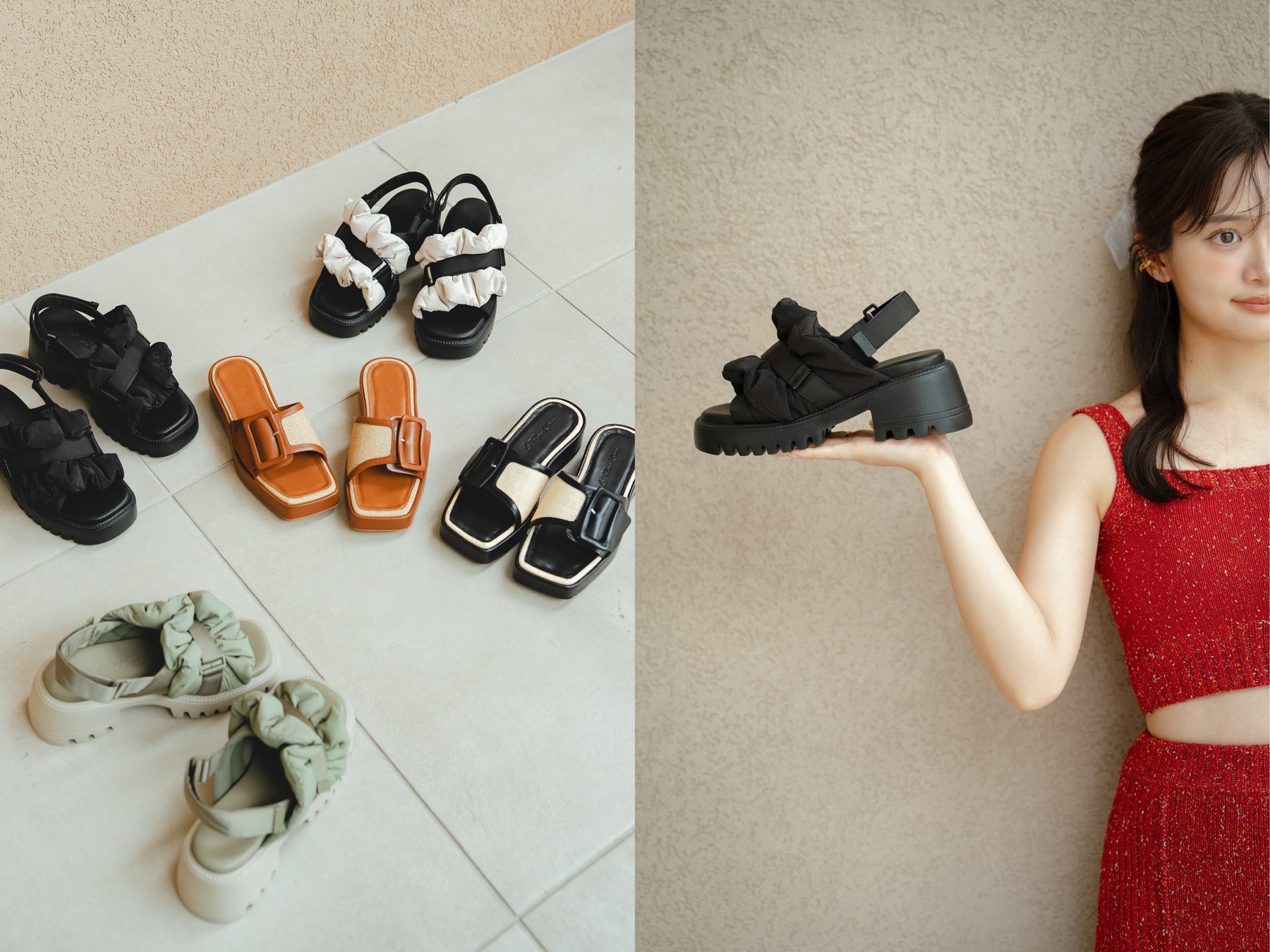 パフィなフリルで愛らしくアレンジしたスポーツサンダルと、大きなベルトバックルとパナマ風素材がポイントとなったスライダーサンダルの2型がラインナップ。