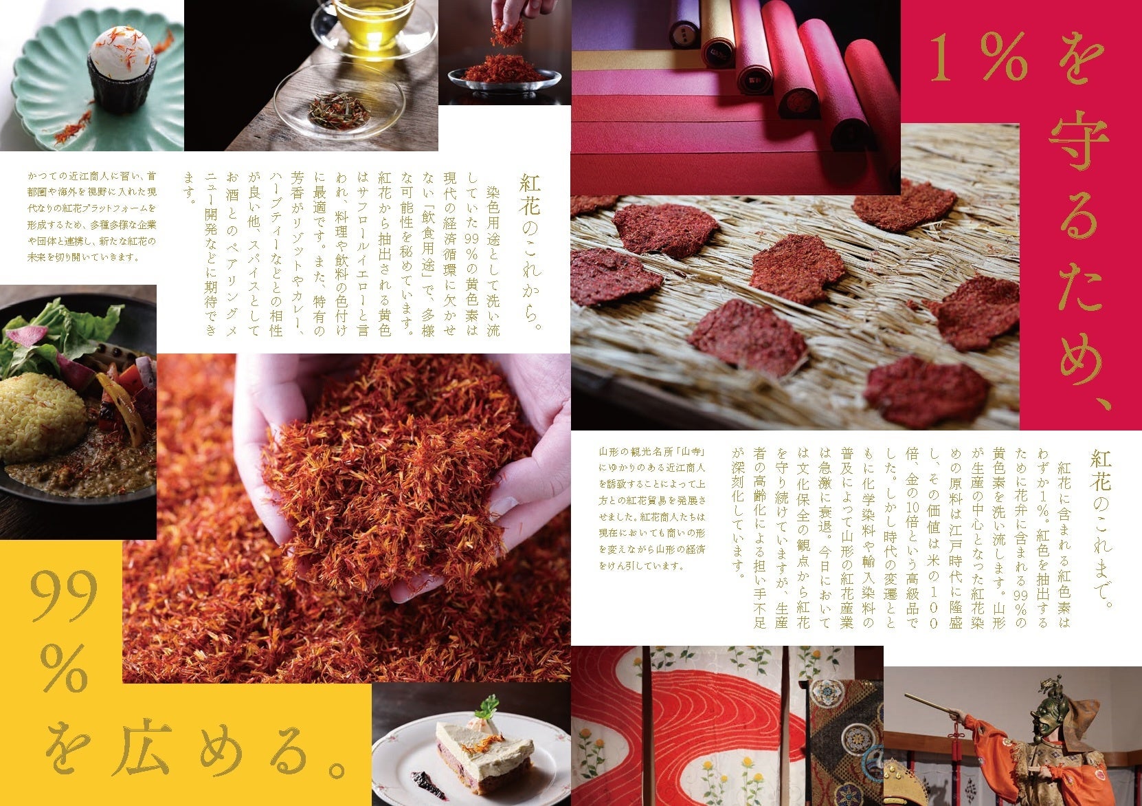 山形紅花プロジェクトは、紅花推進協議会が「1%の紅色を守るため、99%の黄色を広める」をコンセプトに、紅花の普及と認知拡大と紅花産業の活性化を目的に発足されました。