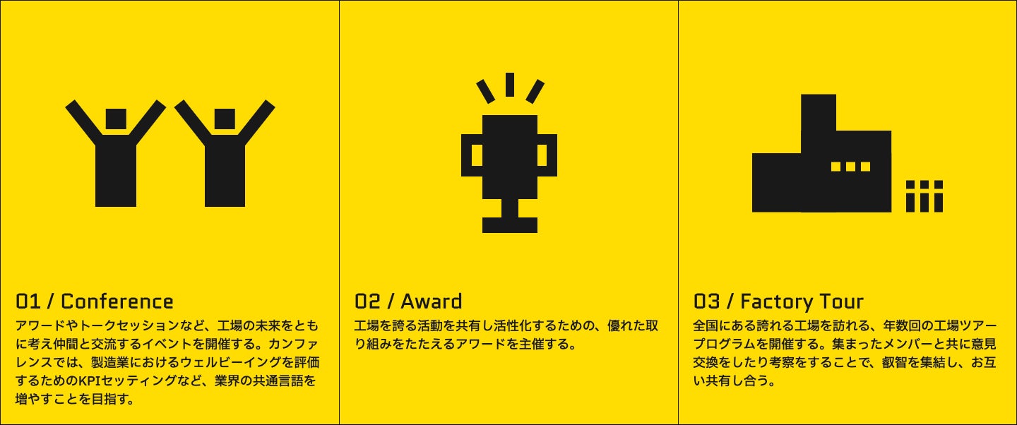 アワードやトークセッションなど、工場の未来をともに考え仲間と交流するイベントを開催します。カンファレンスでは、製造業におけるウェルビーイングを評価するためのKPIセッティングなど、業界の共通言語を増やすことを目指します。
