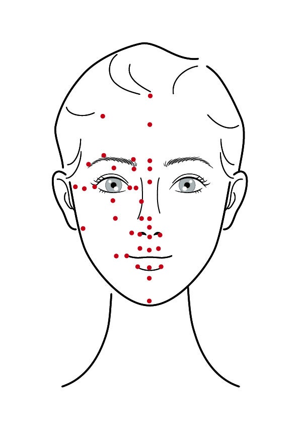 メイクで必要となる、顔の骨格の点。人それぞれ骨格が異なるため、同じ点でも人によって少しずつ点の位置が異なります。現在は35個の点を展開してますが、これ以外にも、まだ公開されていないパーツごとに存在する詳細な骨格の点が存在しており、またトレンドに合わせて新たな点が生まれるため、常に最新のメイクが学べるコンテンツを提供しております。