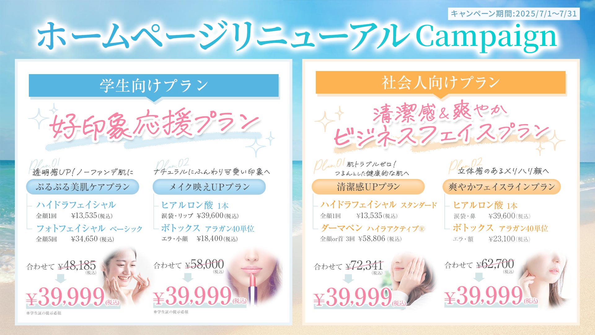 学生向け・社会人向けの2種類のプランを備え、ハイドラフェイシャル、ダーマペン、ボトックス、ヒアルロン酸注射など、人気な美容施術を良心的な価格でご提供します。