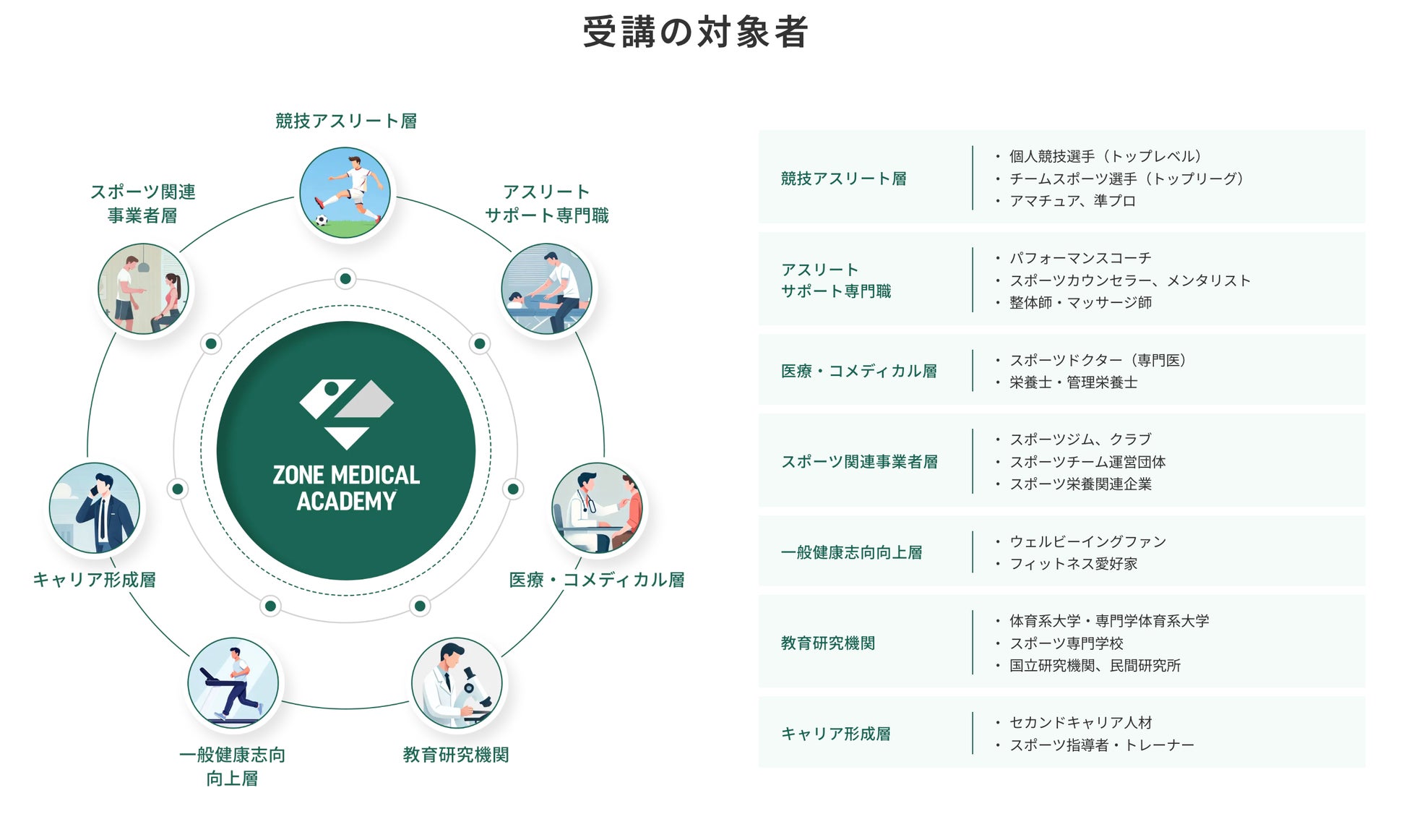 対象は、競技アスリート層、医療従事者、スポーツ指導者、企業サポート部門、教育機関まで多岐にわたり、アスリートを支えるすべての人が自らの現場で即実践可能な内容となっています。