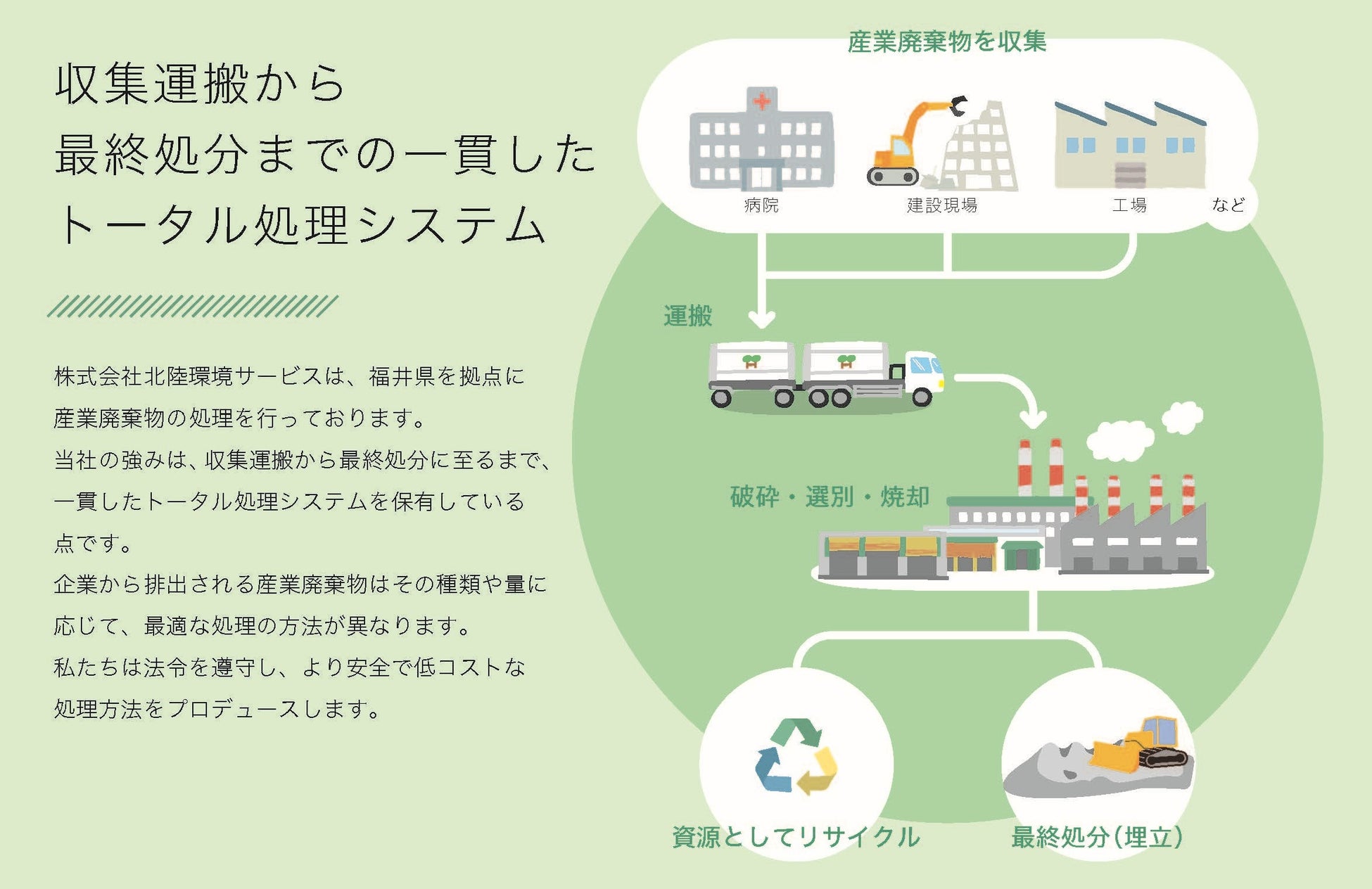 北陸環境サービスは、産業廃棄物の収集運搬、選別及び破砕処理、焼却処理、最終処分を一貫対応し、福井県はもとより関東圏・中部圏・関西圏と広範囲に展開しています。