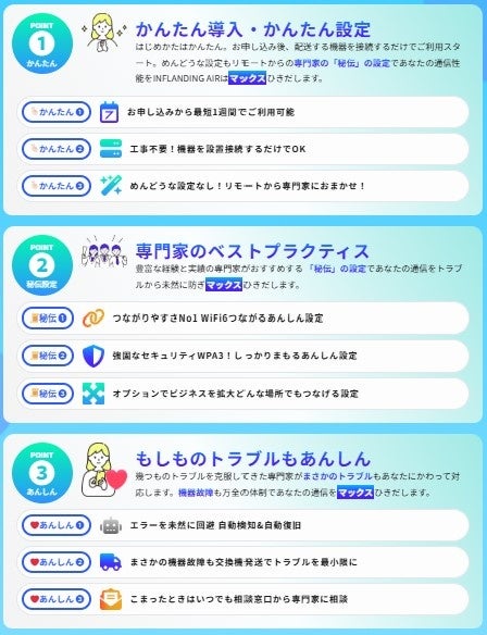 今後は本キャンペーンを皮切りに、関東エリアを中心としたサービス提供を順次拡大し、地域の企業・団体様におけるネットワーク環境の最適化とDX化を支援してまいります。また、ユーザーの声を反映した機能改善や管理性の向上を継続的に行い、誰でも簡単に使えるネットワークインフラの新しいスタンダードとして「INFLANDING AIR」の価値を高めてまいります。