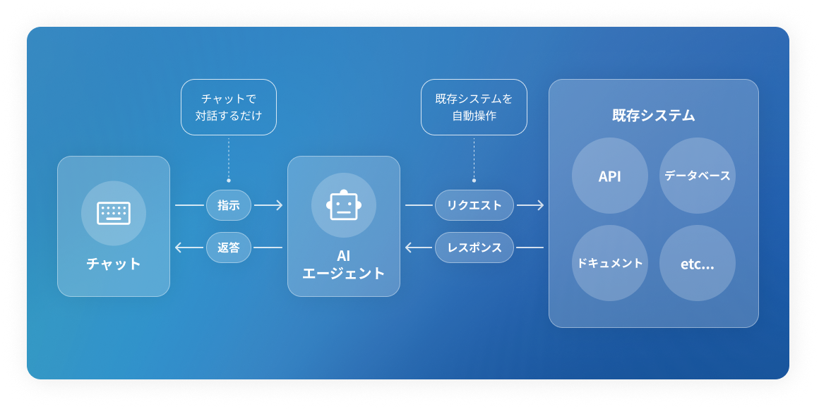 SaaSとして提供するプロダクトをはじめ、社内の顧客管理システムや在庫管理システムなど、APIで構築されたスクラッチ開発のアプリケーションにAIエージェントを導入できます。