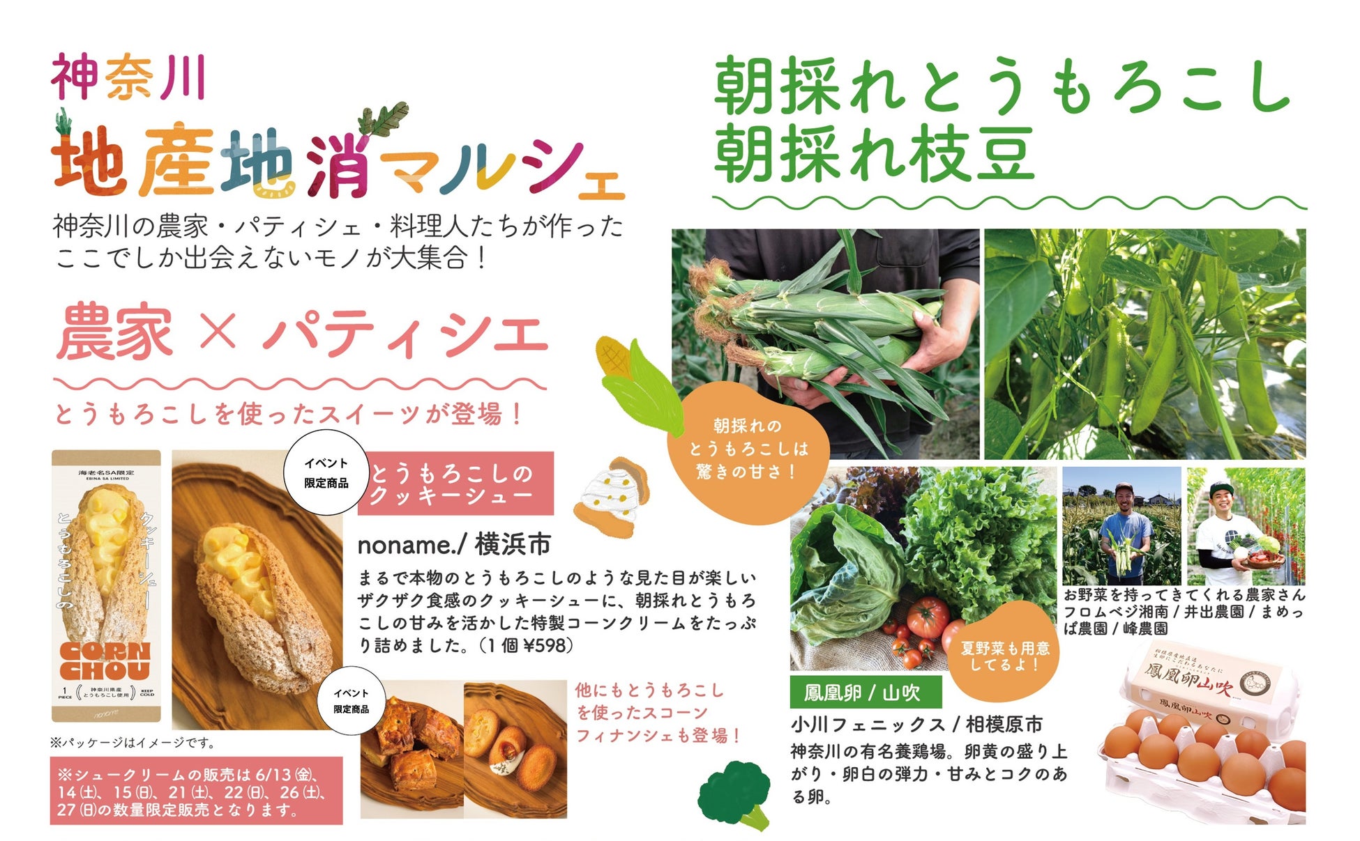 神奈川県に位置する海老名SAは、国内最大級の規模と利用者数を誇るサービスエリアです。多くの旅行者が訪れるこの場所で、地元神奈川の魅力的な産品を集めた「地産地消」をテーマとするイベントを開催します。地元のこだわり生産者が一堂に会し、厳選された野菜や加工品を通じて地域の魅力と、「こんなに美味しいものが神奈川にあったんだ!」と感じていただける逸品の数々をご用意。さらに、マルシェ限定の「地元産朝採れトウモロコシ」と「地元産トウモロコシを使用した限定スイーツ」も特別に販売します。