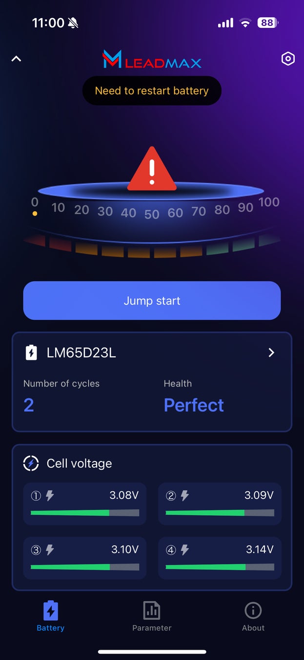 充電残量が低下してバッテリー電圧が規定値まで低下して過放電保護機能が働きバッテリーがシャットダウンされた状態ではアプリケーション内にジャンプスタート機能が表示されアプリケーション内のJumpStartスイッチをONにしてエンジンを再始動する事ができます。