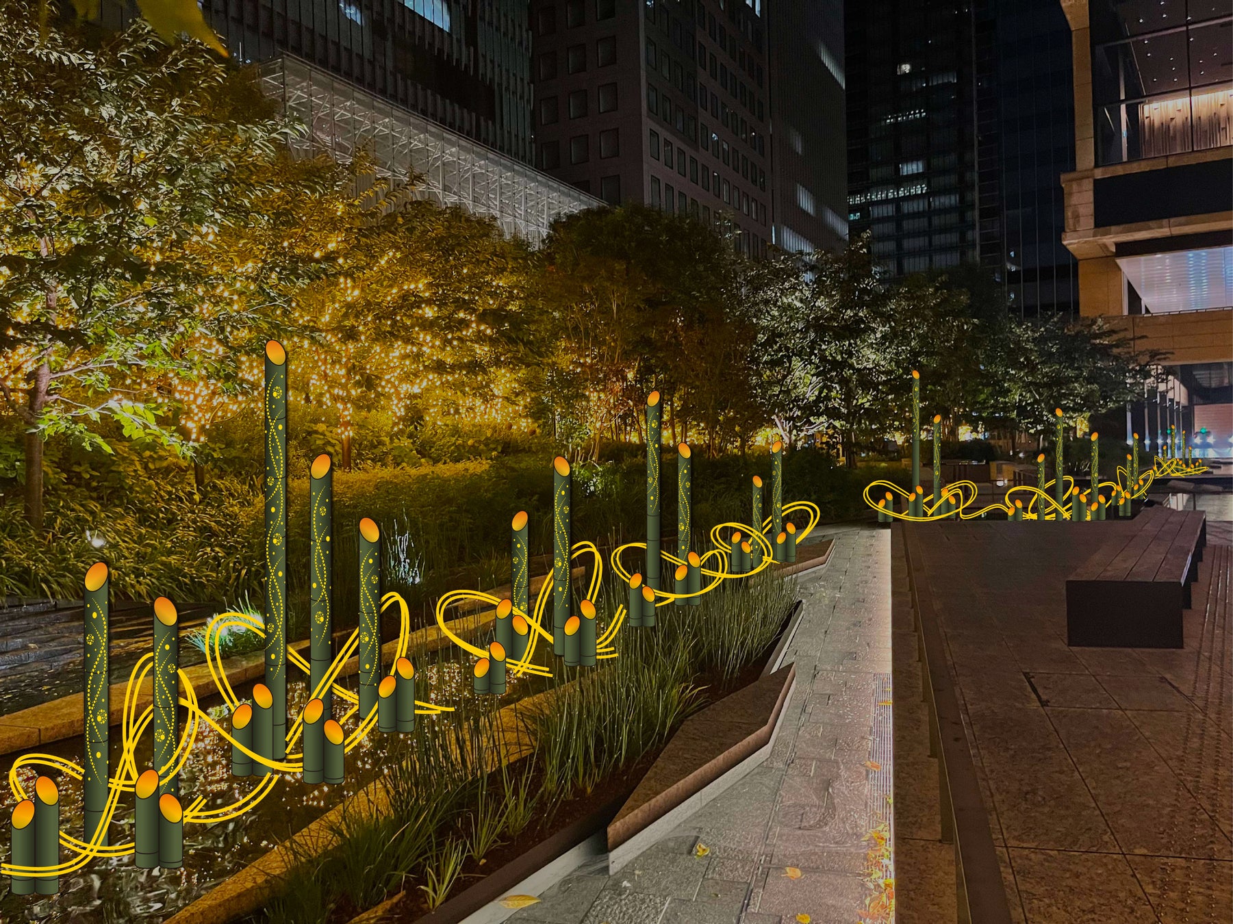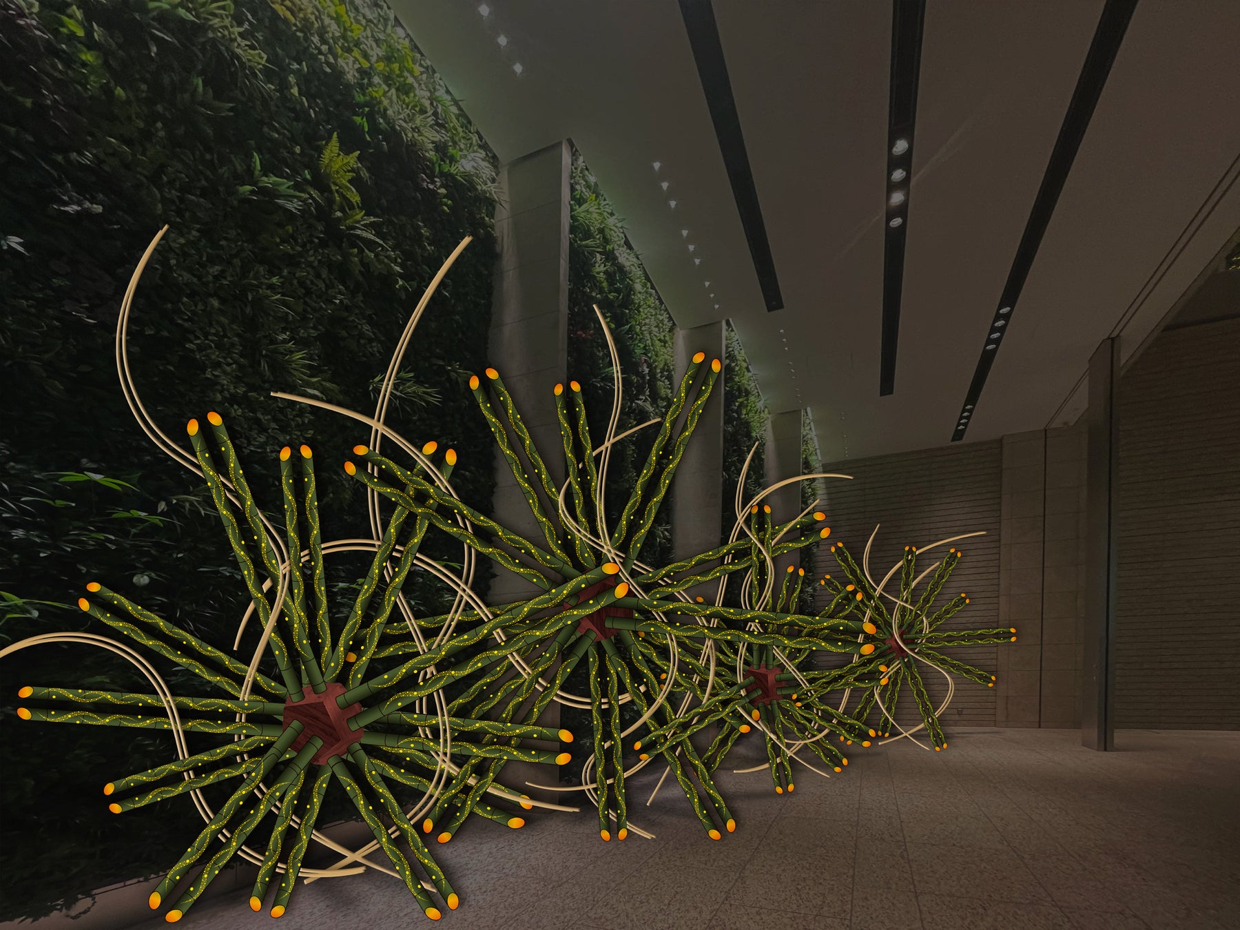 Otemachi Oneのコリドーに広がる「灯りの蕾」は、ゲートウェイプラザで凛然とした『凛』の姿を見せ、インペリアルフォレストの深い樹影が内側から『充』実感を呼び起こします。シェードガーデンとウォーターガーデンでは光のしずくが『恵』みを降らせ、水面の煌めきがその存在を『讃』える。ロビーで交差する人々をあかりの 架け橋が『繋』ぎ、大階段で刻まれるステップが物語を『紡』ぎ出す。階段下では光の粒子が宙に舞い、新たな息吹を『躍』らせ、オフィスロビーで最後に花開く閃光があなたの心に『閃』きをもたらします。蕾、花咲く あかりの旅路をどうぞお楽しみください。