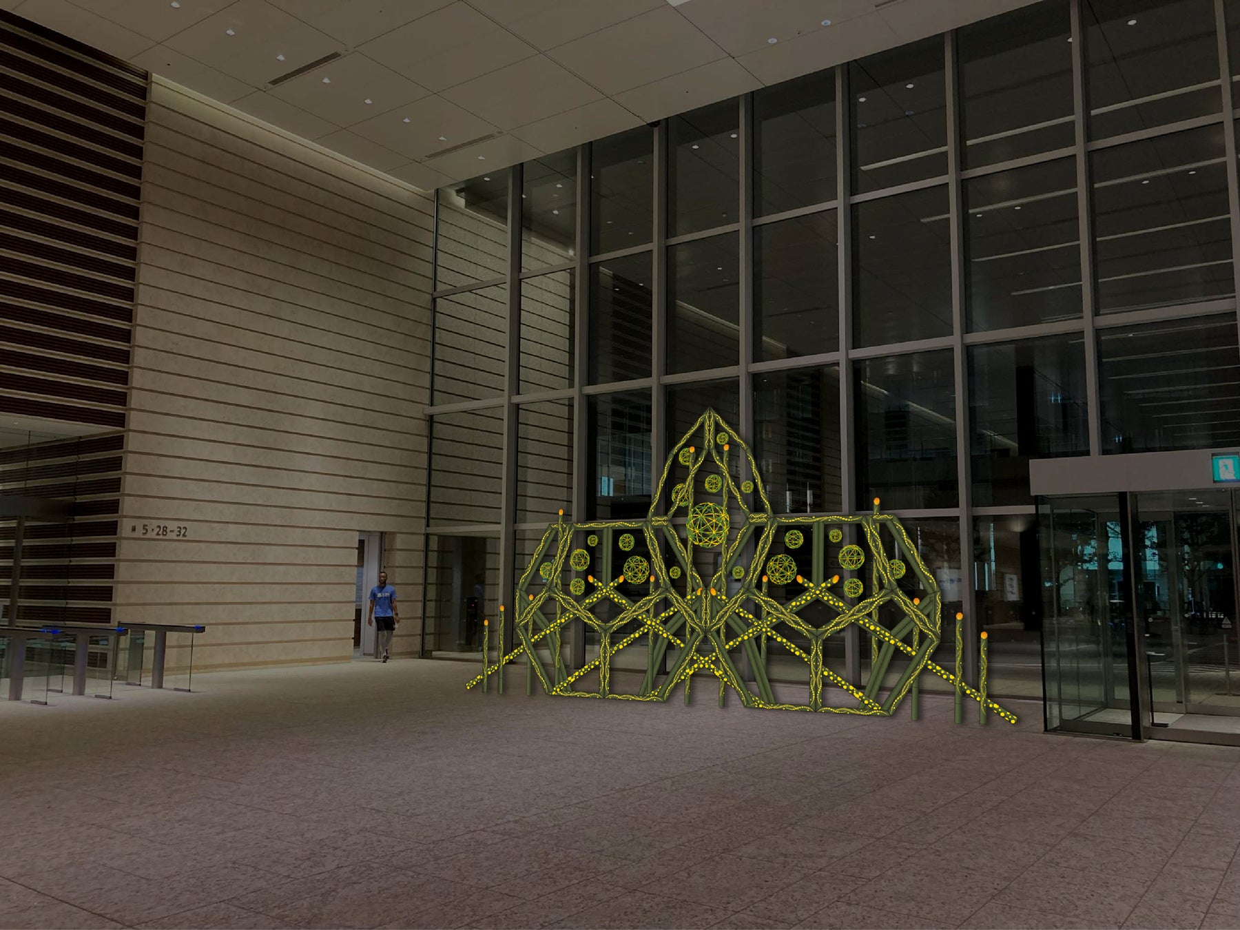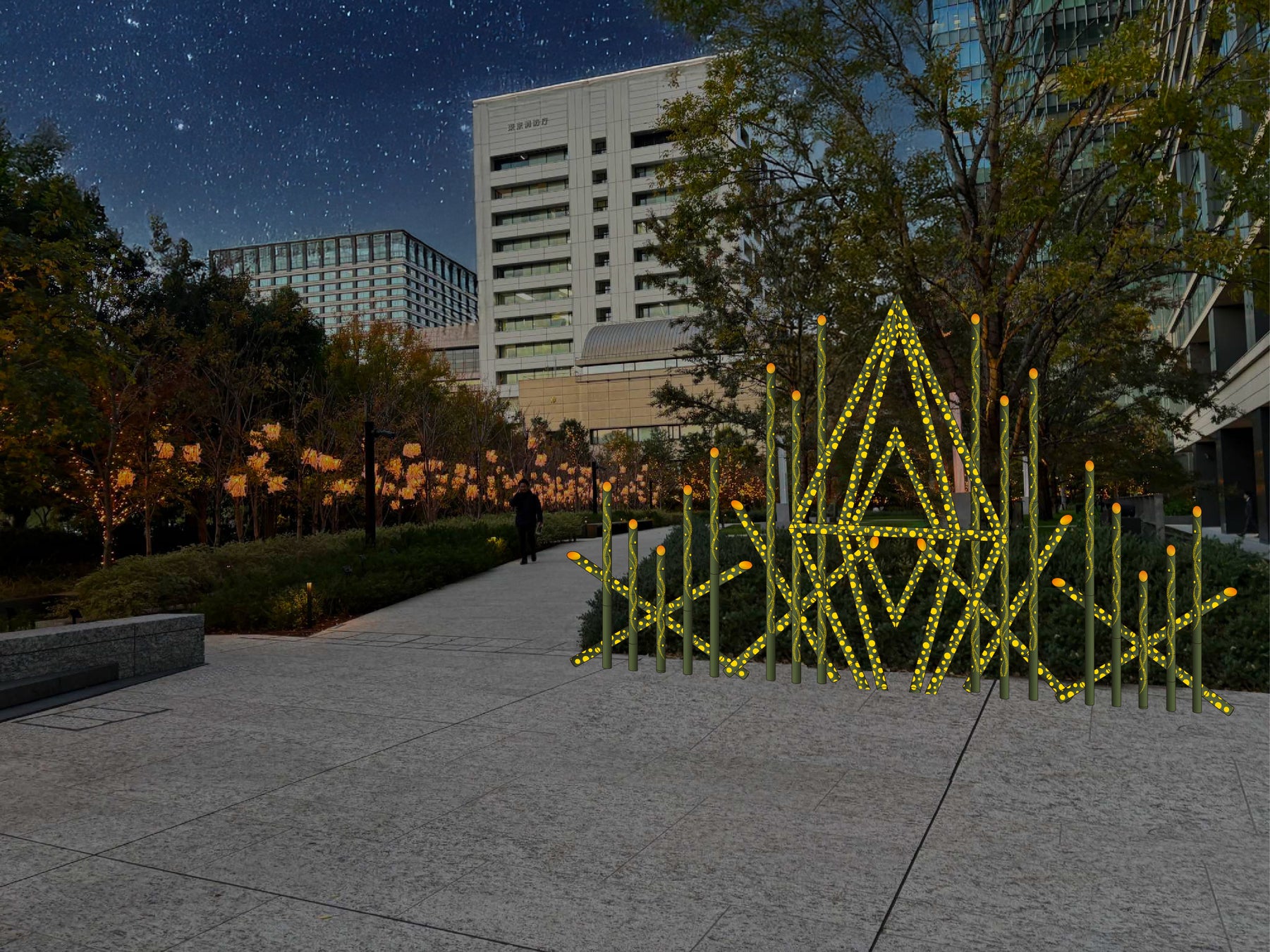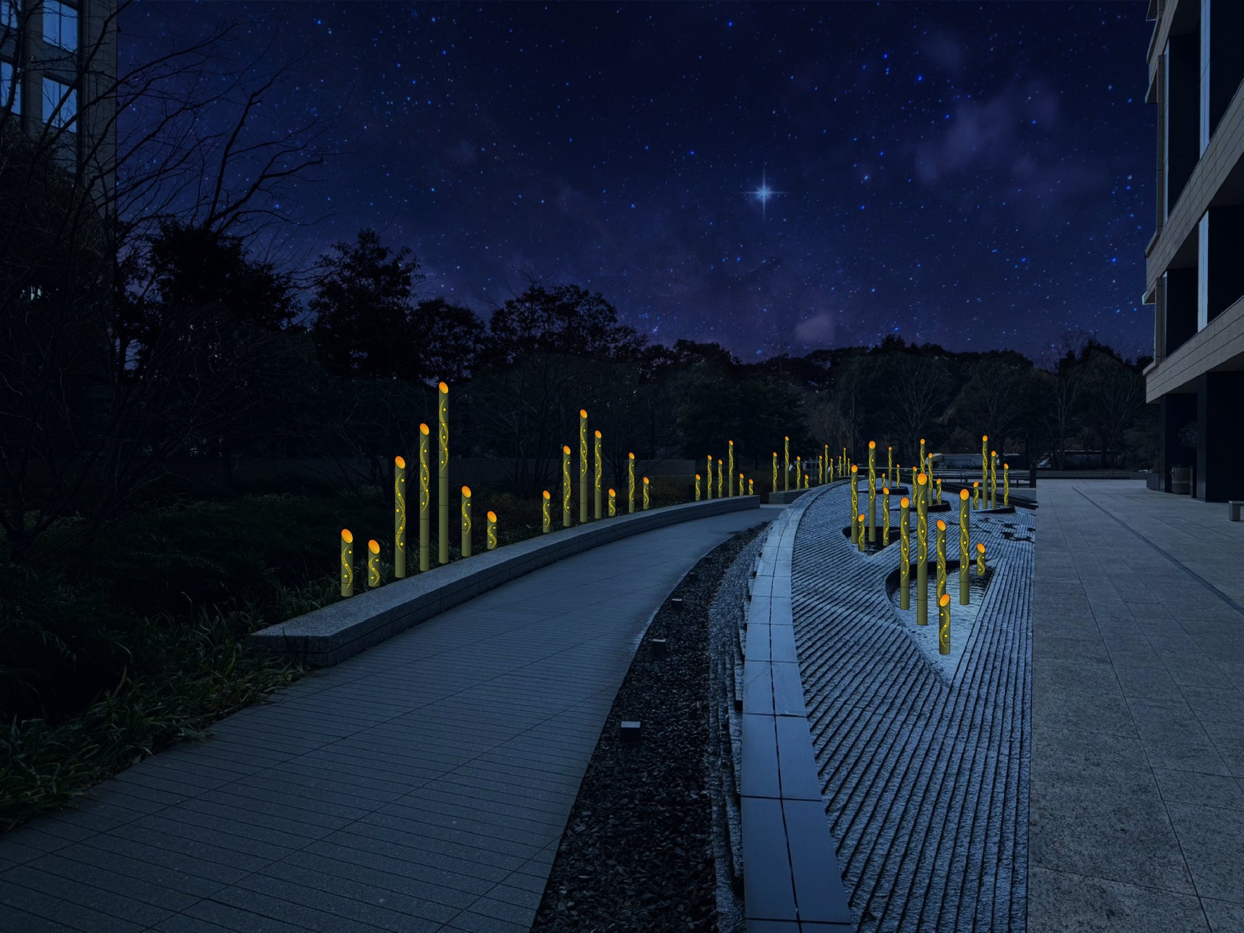 一閃のあかりが夜の帳をひらく、強く、しなやかに。オフィスワーカーが最も多く行き交う場所に、“ひらめき”や“感性”を感じる装飾をお楽しみください。