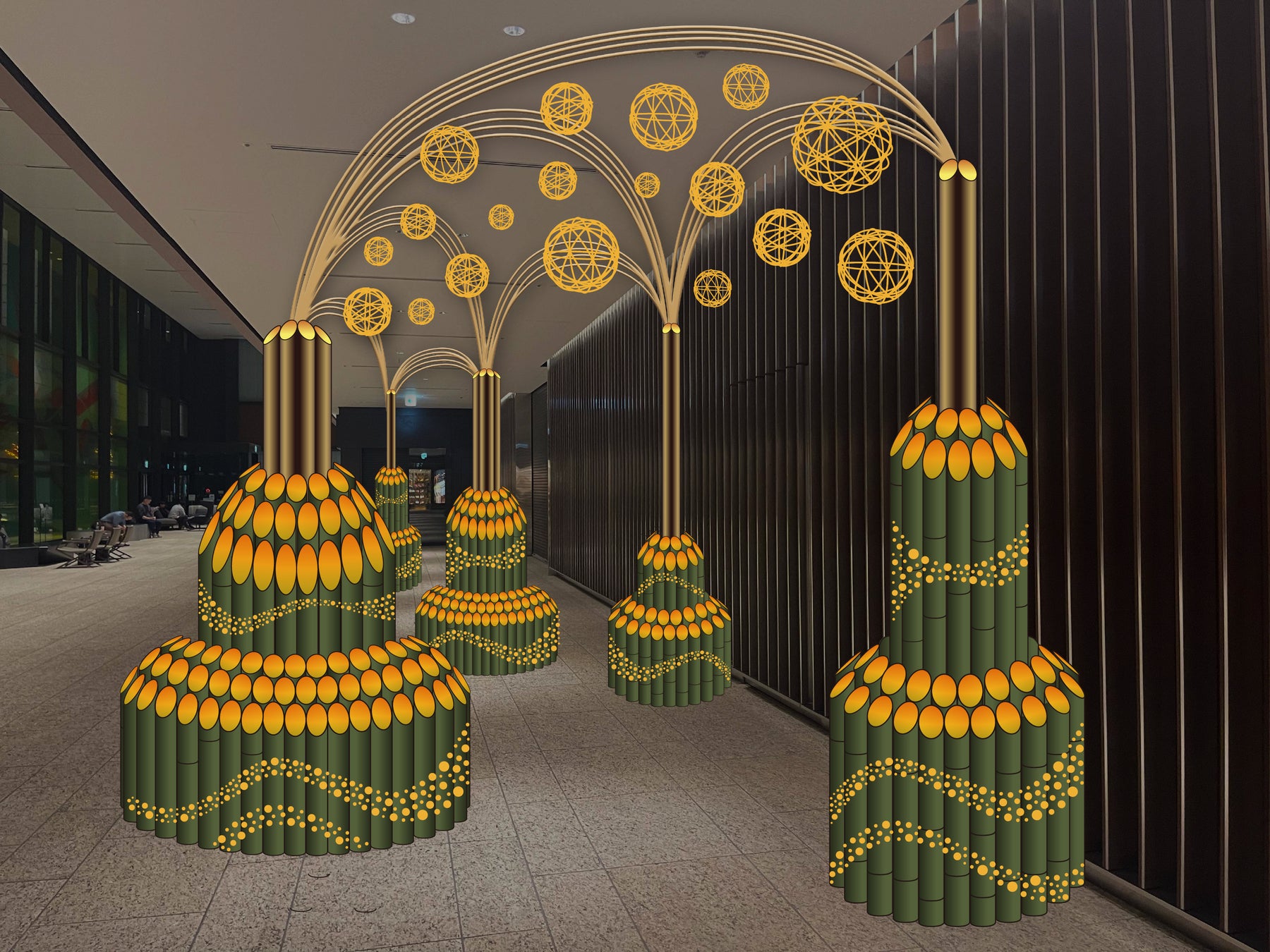 あかりの躍動が、未来のバトンに。ダイナミックな演出が特徴。印象的な竹あかりの造作で、活力を感じられる空間です。