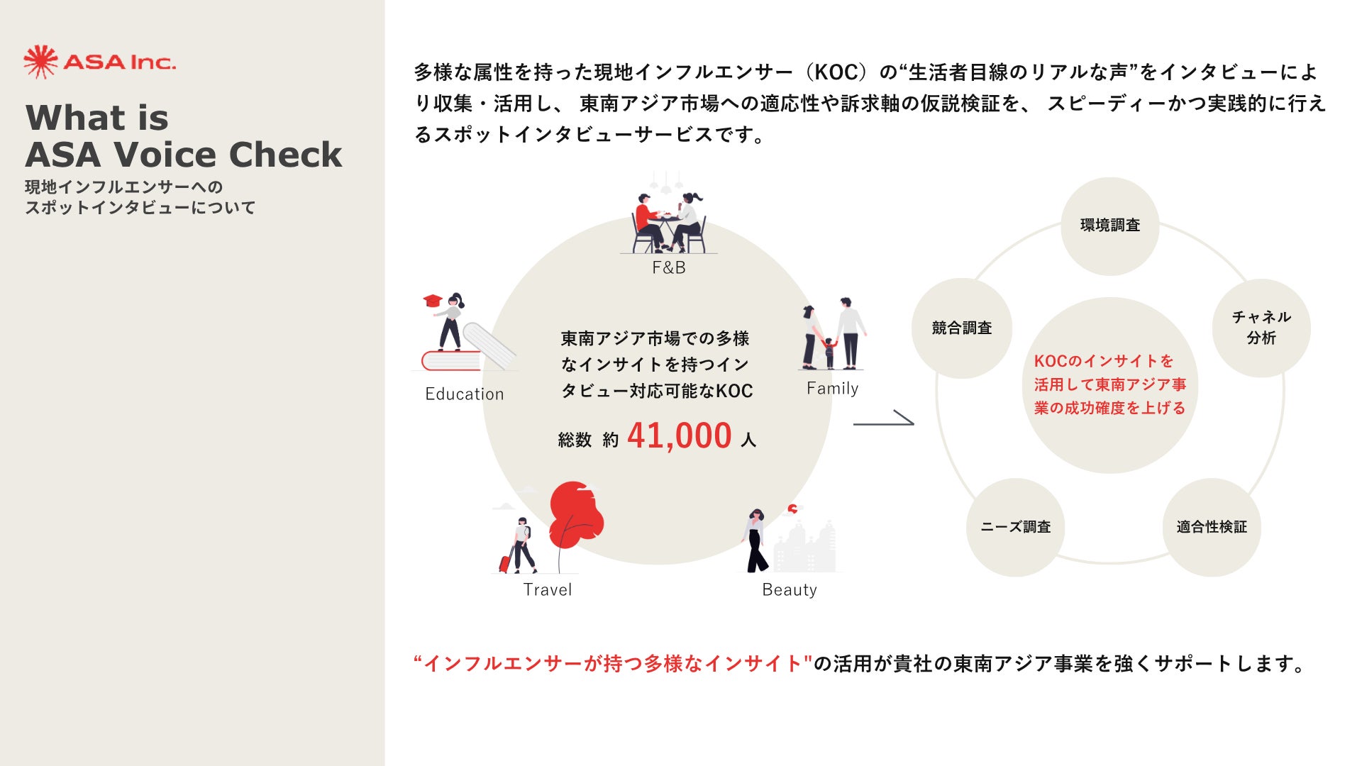 従来のデスクトップ調査やアンケートでは把握しづらい「現地Z世代・ミレニアル層の感覚」を、SNS上で影響力を持つKOC(生活者インフルエンサー)へのスポットインタビューという手法で、短期間かつ低コストで獲得可能にしたのが「ASA Voice Check」です。