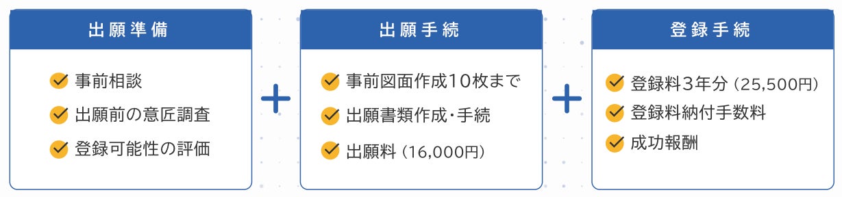 出願前の簡易調査から、図面、書類作成、出願手続から登録手続きまで必要な手続きがまるっと含まれて業界最安値クラスの15万円です。