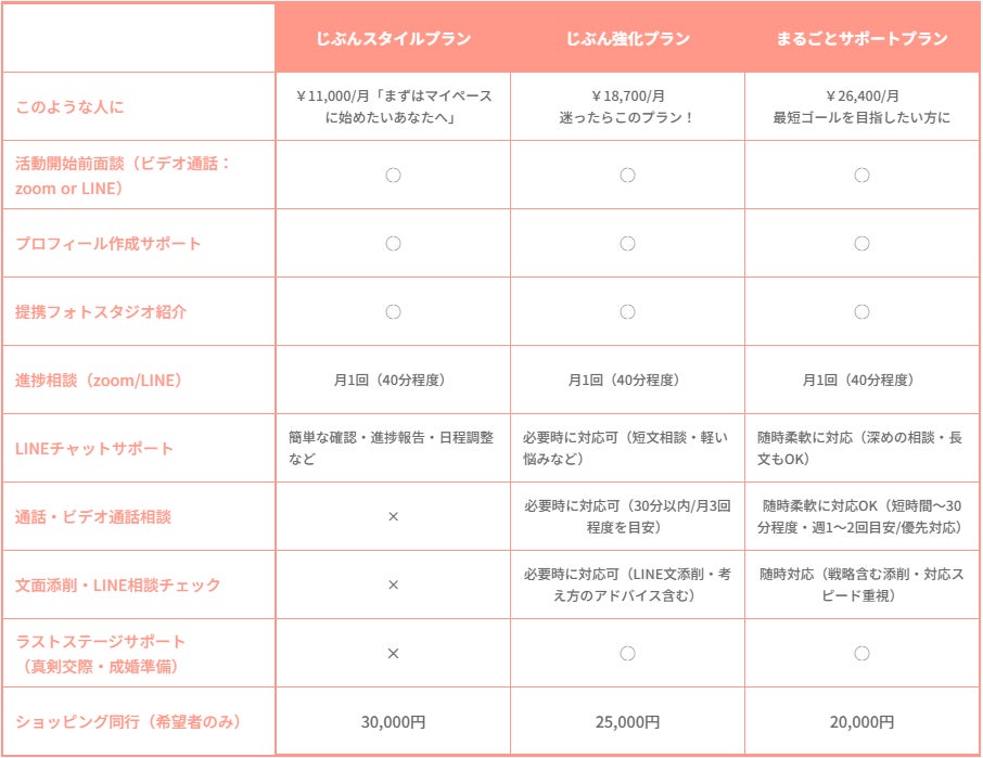 3種類のプランを用意しており、今まで異性とのお付き合いの経験が豊富にある方からお付き合いの経験が一切ない方までそれぞれにあったプランを選択いただけます。