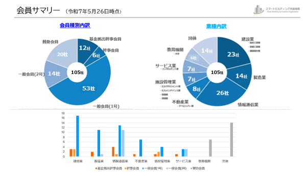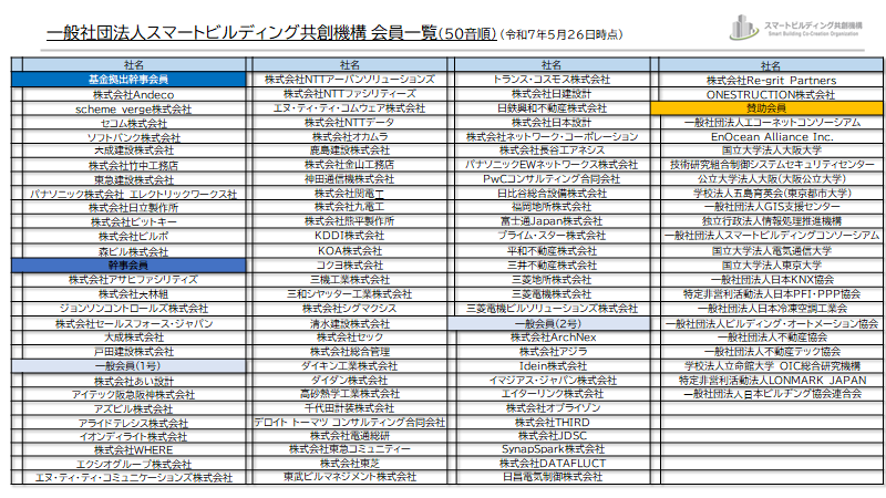 スマートビル共創機構は2025年4月2日に発起人により設立され、会員の募集を進めてきました。会員の内訳は、発起人である基金拠出幹事会員12社(ホームページで公開中)に加え、新たに加わった幹事会員6社、一般会員67社、賛助会員20団体からなる計105企業・団体など(2025年5月26日時点)で、建設業・不動産業・製造業・情報通信業・施設管理業・サービス業・教育機関・公的団体と業種や業界を横断した多種多様な構成になっています。(別紙ご参照)