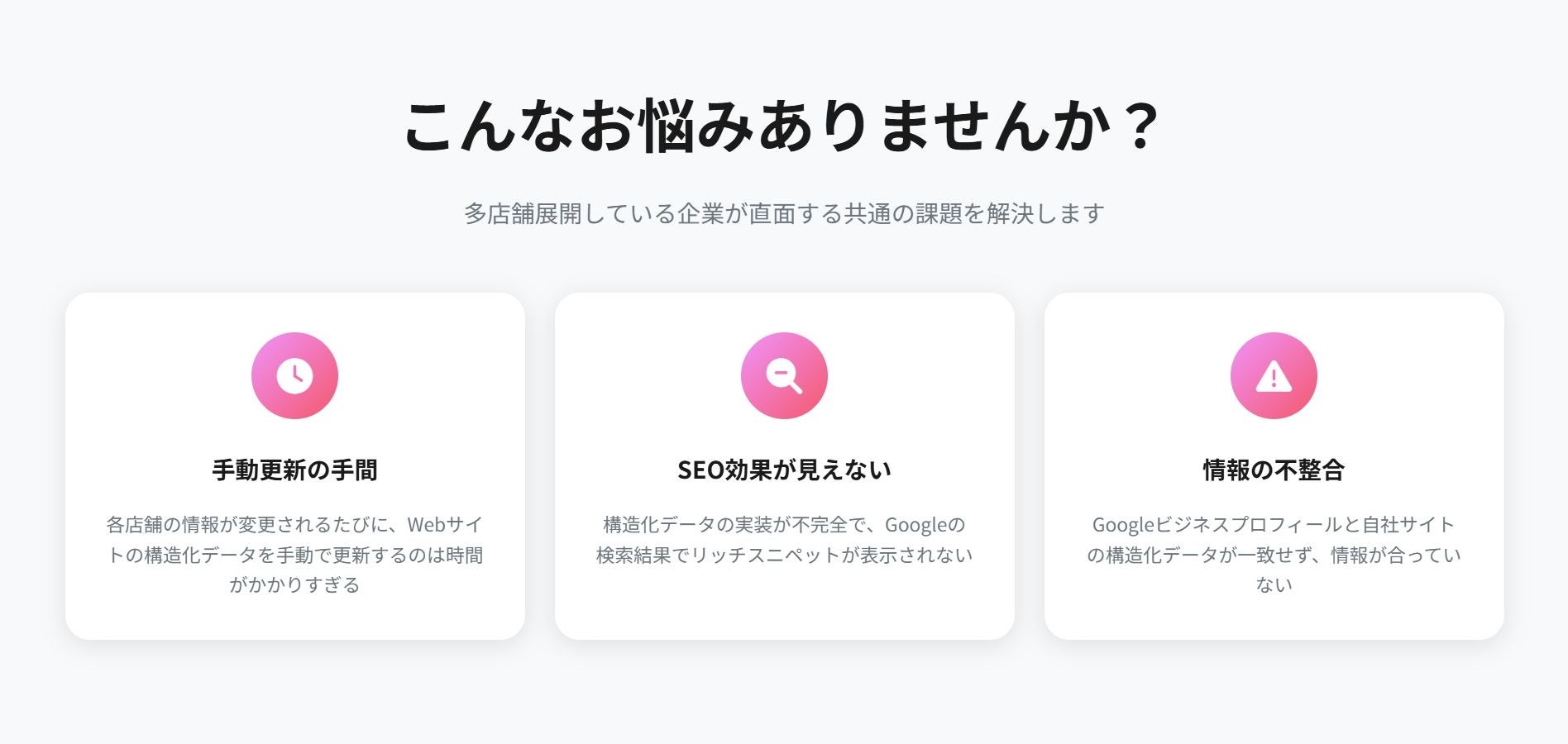 LocalSyncを使えば、構造化データだけが自動で最新状態に保たれるため、情報の不整合リスクを防ぎつつ、Web担当者の作業をゼロにできます。