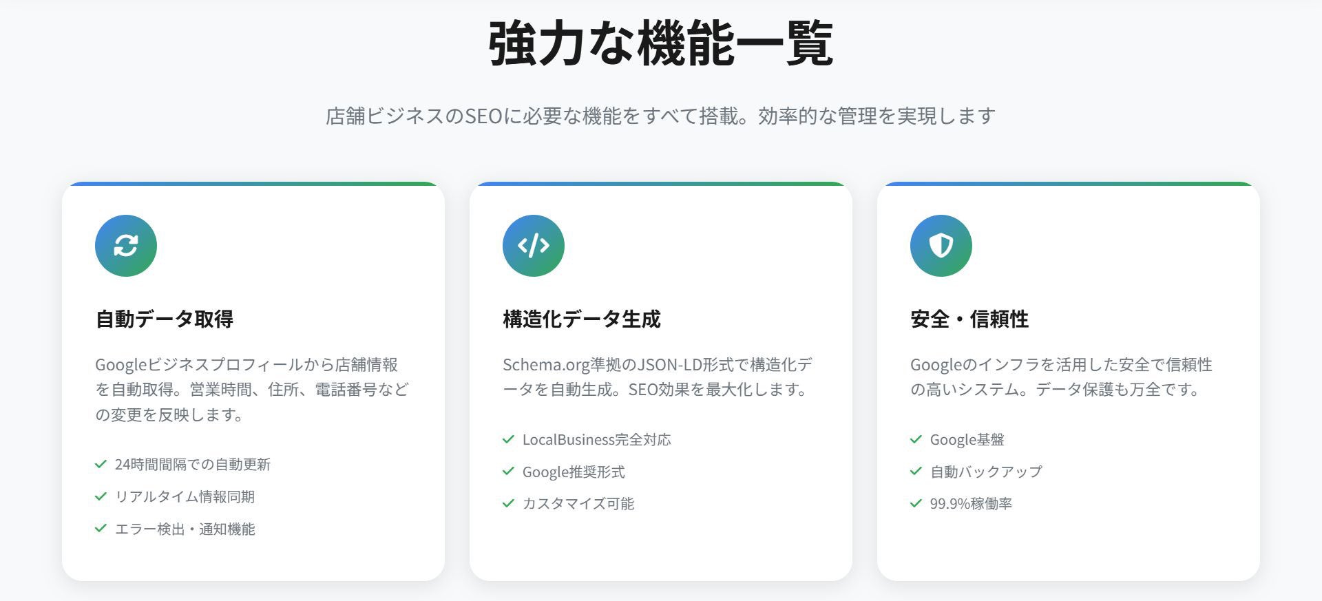 同サービスでは、Googleビジネスプロフィールの情報を自動で構造化データに変換して、専用コードを発行して店舗ビジネスのSEOを自動化します。