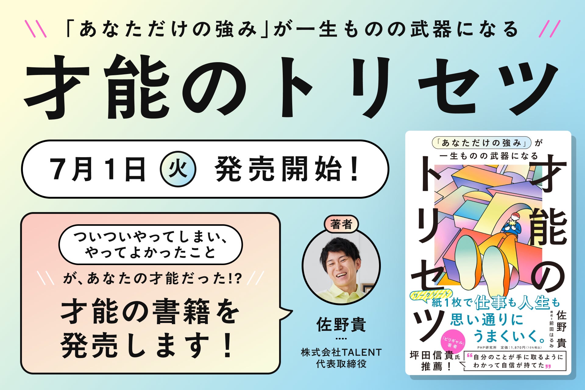 個人の才能を引き出し、チームや会社のパフォーマンスを上げる、株式会社TALENT(東京都中央区・代表取締役 佐野貴)は、初めての著書 「あなただけの強み」が一生ものの武器になる才能のトリセツ(佐野貴 著・前田はるみ 構成/税込1,870 円/PHP研究所)を2025年7月1日(火)に発売いたします。本書は、誰もが持つ「才能」を言語化し、それを生かすための“あなただけの取扱説明書”を完成させる一冊です。