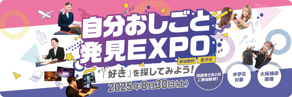 学校法人山口学園(所在地:大阪市北区、理事長:酒元英二)は、2025年8月30日(土)に中学生を対象とした職業体験イベント「自分おしごと発見EXPO~自分の好きを探してみよう~」を開催いたします。
