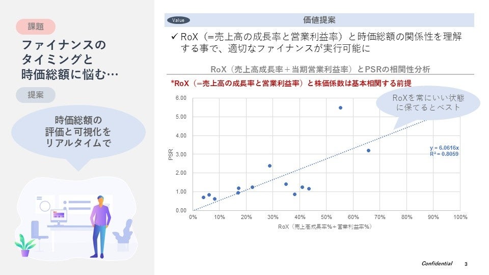 毎月の経営KPIに基づいて、時価総額の算定を行います。ENOLA独自のツールと類似企業比較法を用いて、PSR・PERと相関性の高いKPIの組み合わせ(例:売上高成長率・営業利益率等)を特定し、個社毎の時価総額評価モデルを策定します。月次でPLを締めるたびに、その時点の経営KPIに基づいた時価総額を算出・更新します。本取り組みは、KPIと企業価値の連動を見える化することで、経営陣が「正しい投資」と「その成果(=売上高成長率・営業利益率)」に対する共通認識を持つ事を促進します。常に企業価値の変動を意識し、将来の資金調達ラウンドに対しての「最適なタイミングを常に理解しておく=Finance Ready」な状態を維持するための分析なります。