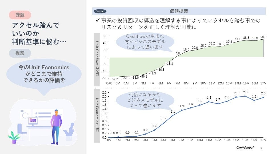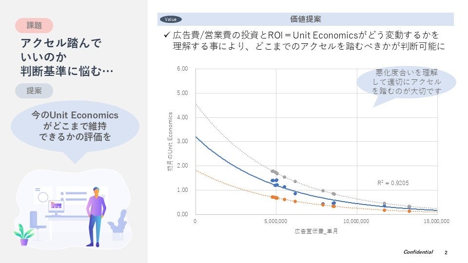個社ごとの予測モデルを構築することで広告宣伝費・営業費への投資増加に対するUnitEconomicsの悪化度合いのシミュレーションを可能にします。一定水準のUnit Economicsを維持した上で現在の事業が達成可能な将来売上がいくらなのかを、毎月評価・判断し、スケールに対しての投資タイミングと投資金額の最適な判断を促します。