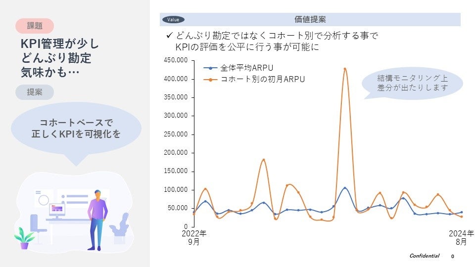 Unit Economics・LTV・継続率・ARPU・CAC等の主要KPIをSegment / Target / Channel(STC)単位で毎月分析し、現行の戦術・戦略の評価や次の戦略・戦術レベルでの機会・課題を特定し、データから経営レベルの良質な意思決定を可能にします。
