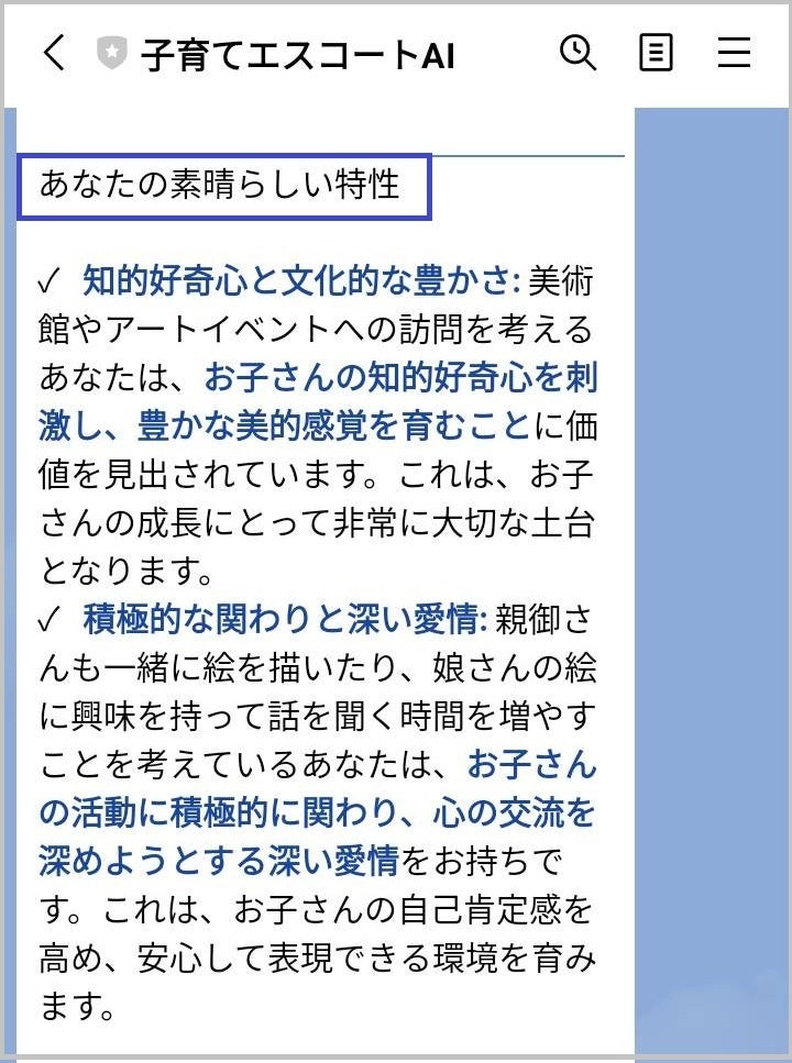 「子どもの特性や興味を深く掘り下げてくれる対話を通じて、AIとの対話が親子の会話の素敵なきっかけになりました」[3児の母]