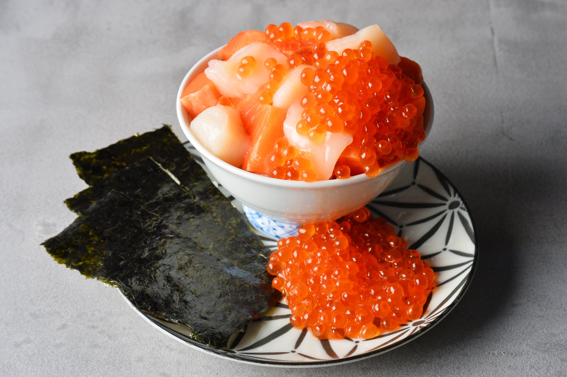 北海道「いくら・ホタテ」、函館「函館サーモン」が贅沢に溢れる海鮮丼とセットでお召し上がりいただくのがおすすめです。