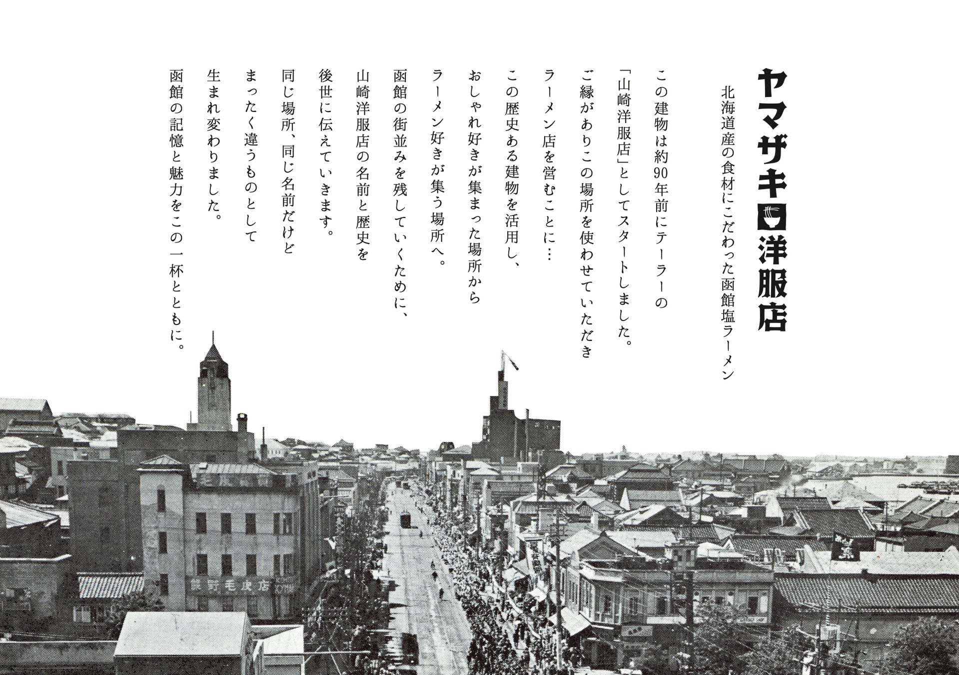 また、内外装に於いても古き良き函館の街並みを継承すべく、約90年前に「山崎洋服店」として営業していた店舗を活用いたしました。家具や看板、トレーなど随所に函館の木材を使用し、函館の職人の手によって可能な限り北海道産・函館産を追求。地域の方をはじめ、観光にいらした皆様が気軽にお立ち寄りいただけるようリニューアルいたしました。函館港や函館山麓、和洋が融合したハイカラな街並みを残す西部地区で、五感いっぱいに函館の記憶と魅力を感じていただくことができるラーメン店です。